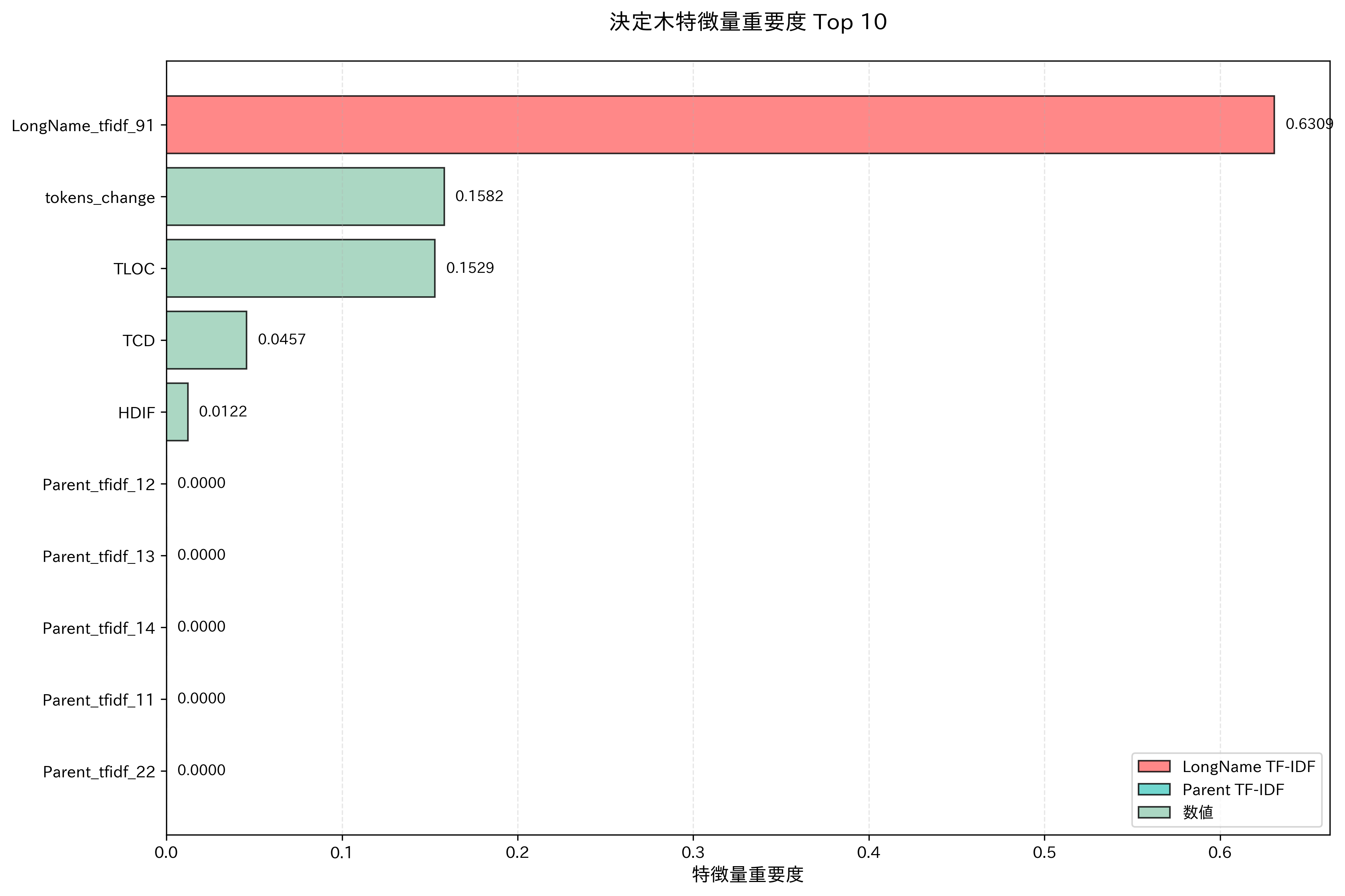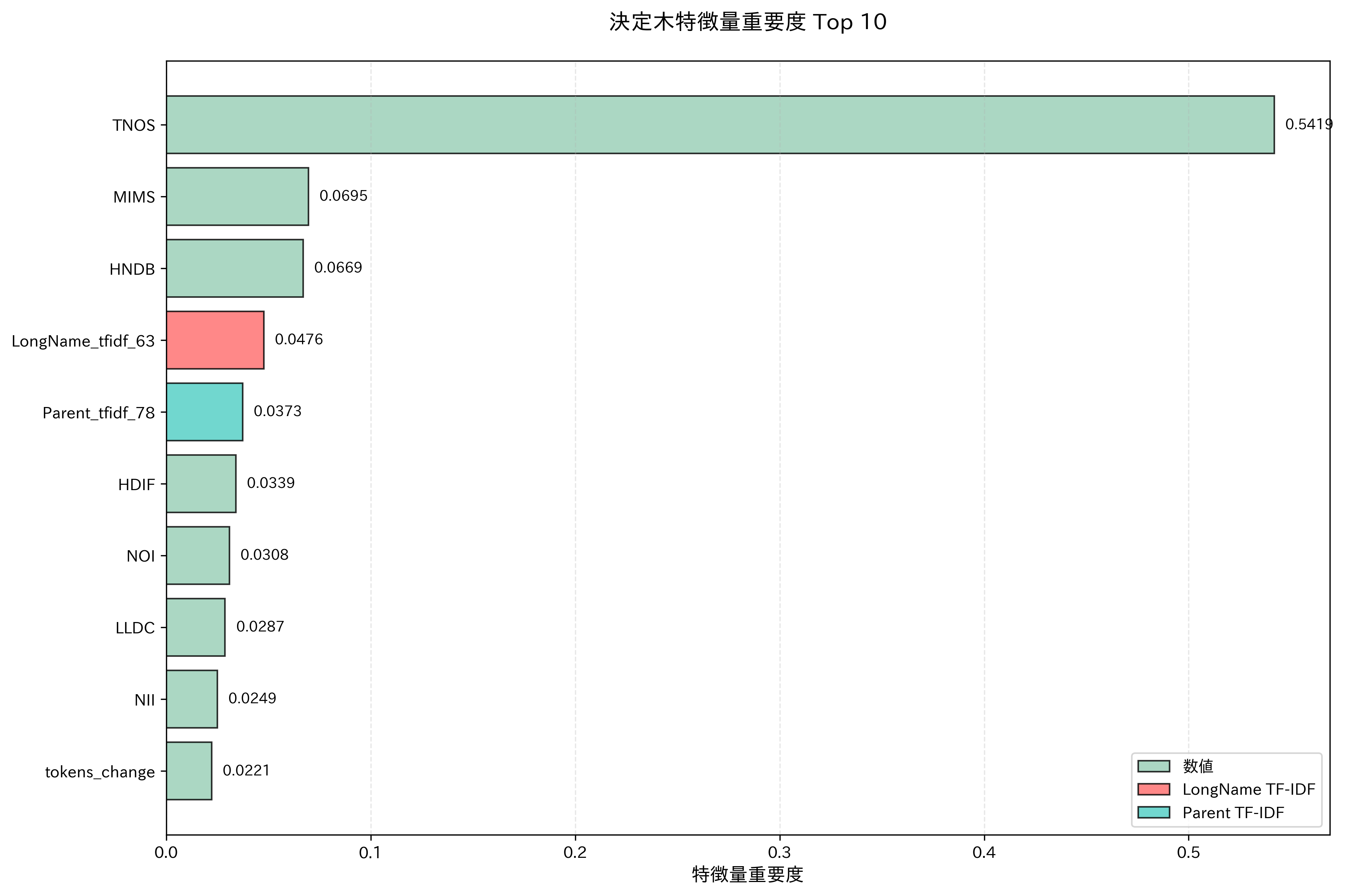 - LongNameに含まれる特定の単語の重要度が0.139以下ではない -> TLOC(Total Lines of Code)が-0.05以下のときにジニ不純度がおよそ0.07となり、陰性クラスを高い確率で分類している