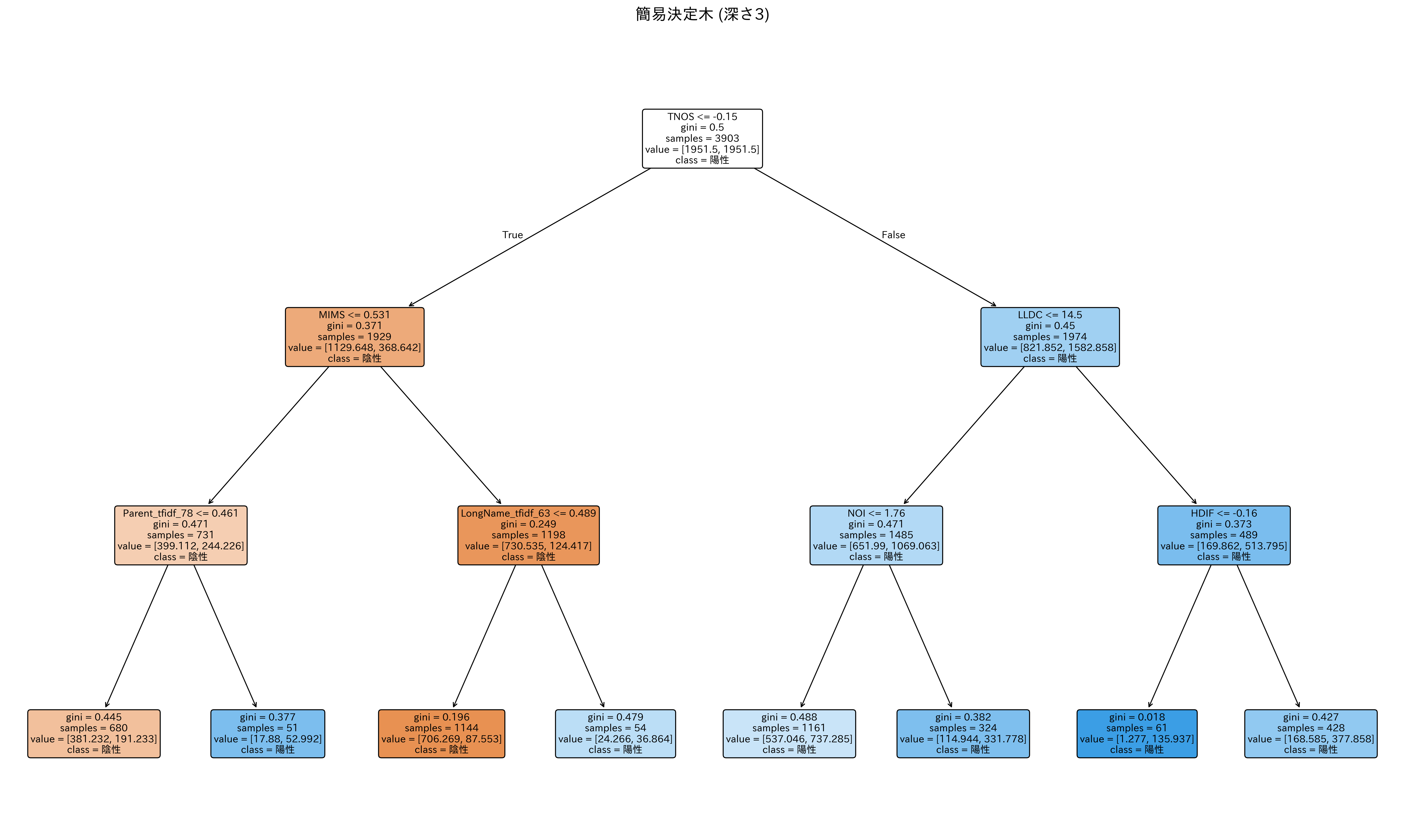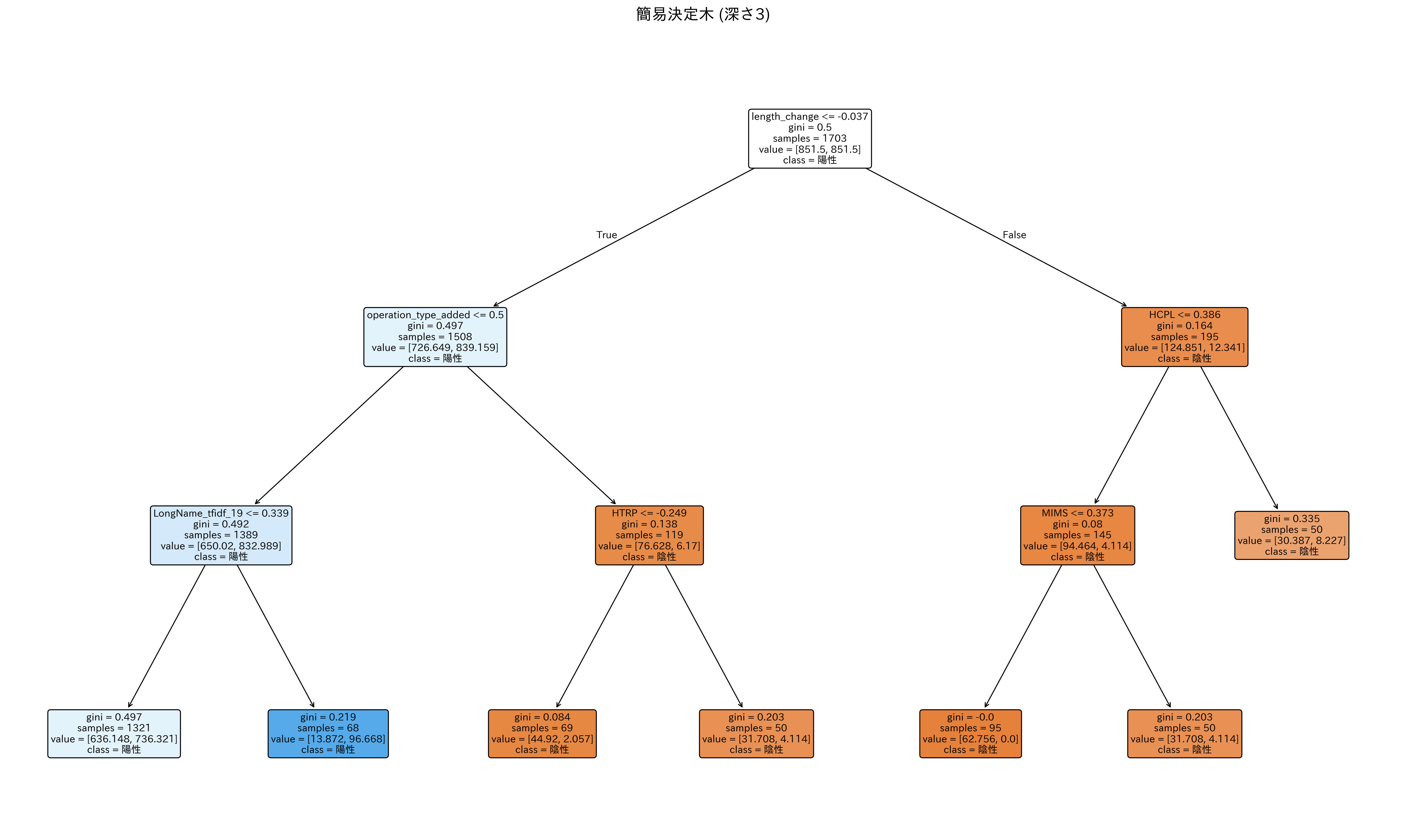 - LongNameに含まれる特定の単語の重要度が0.139以下 -> トークン数の変化量が-0.136以下のときにジニ不純度がおよそ0.19となり、陽性クラスを高い確率で分類している