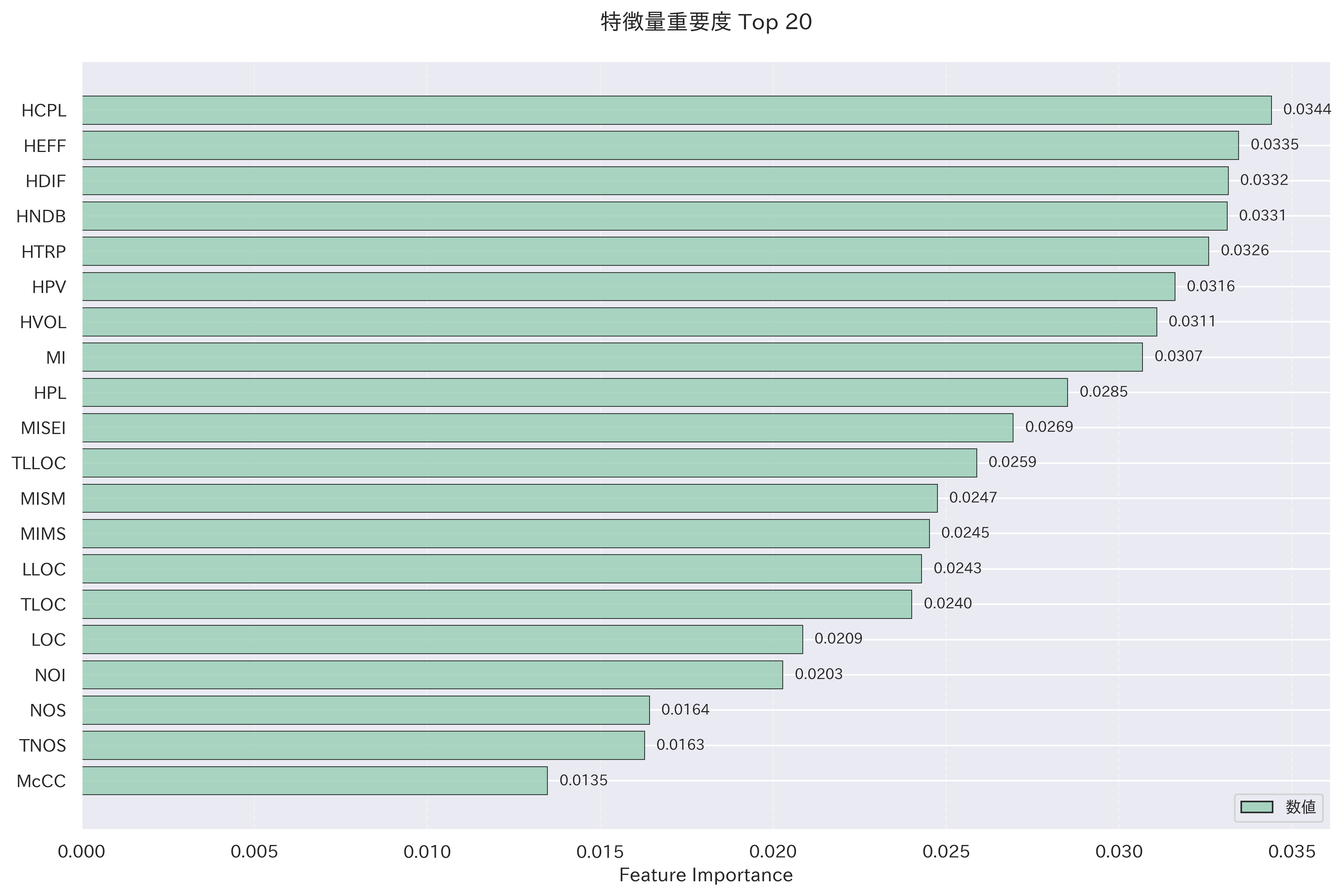 - ハルステッドメトリクスは重要度が高いが、数値的な重要度はあまり高くないことを示唆している