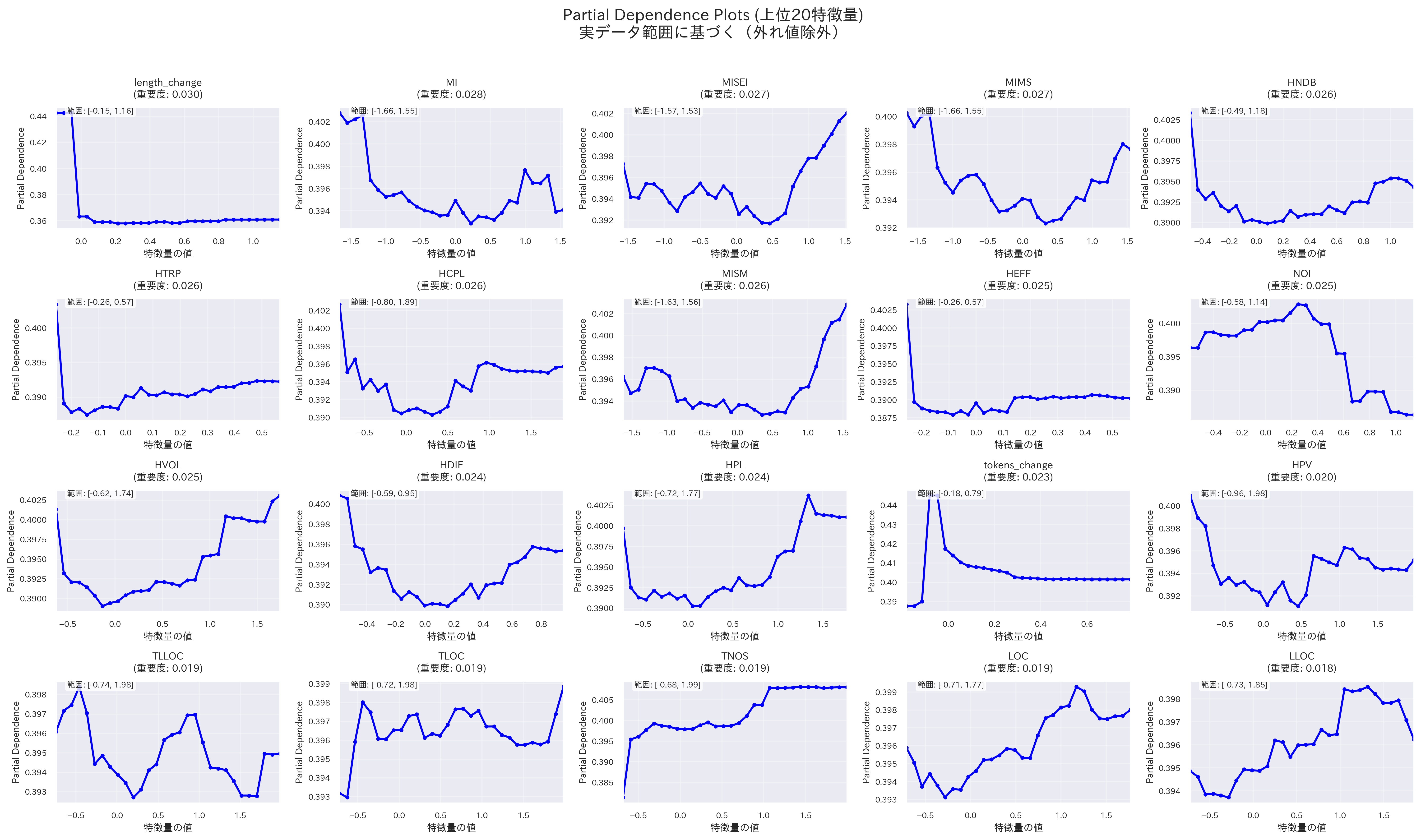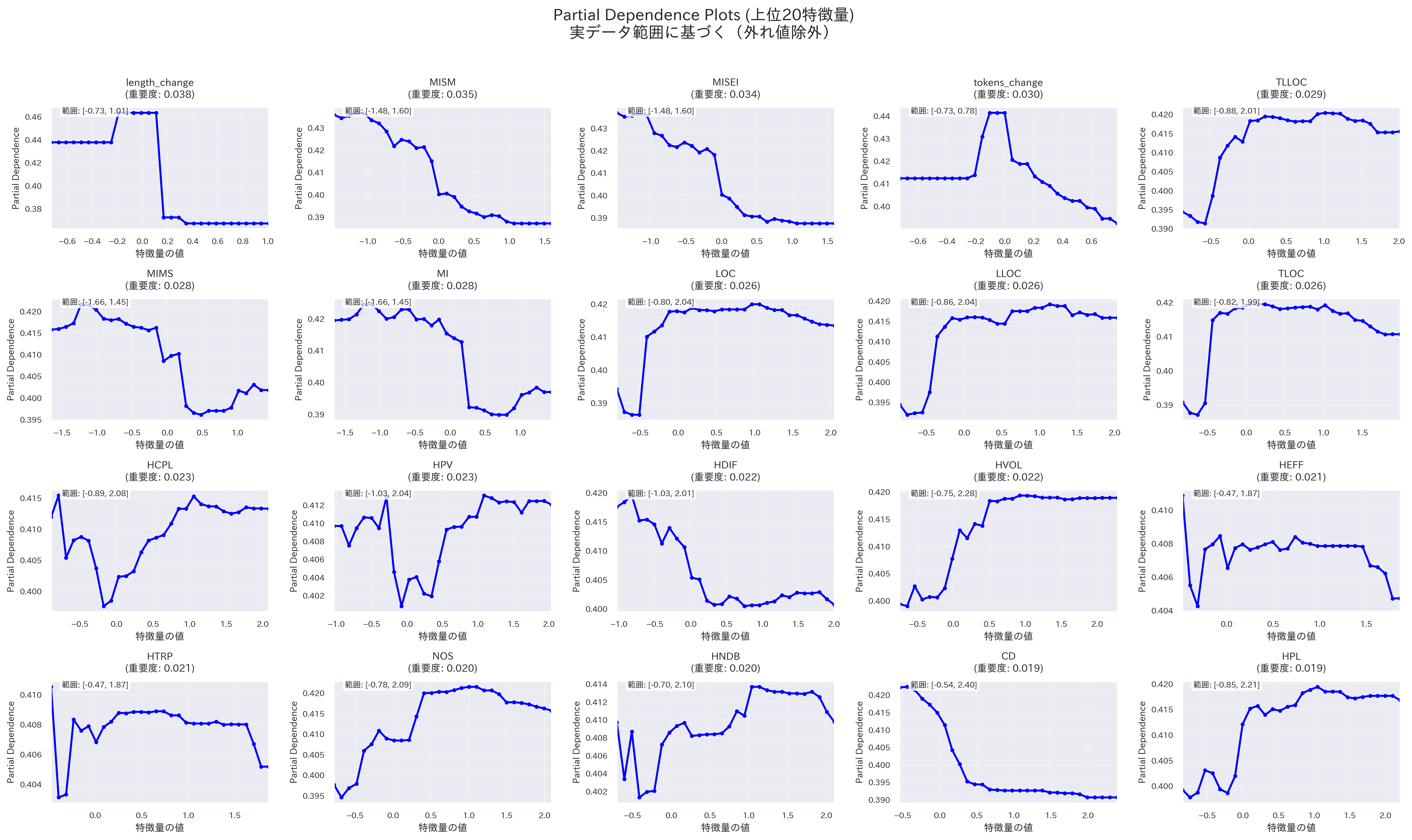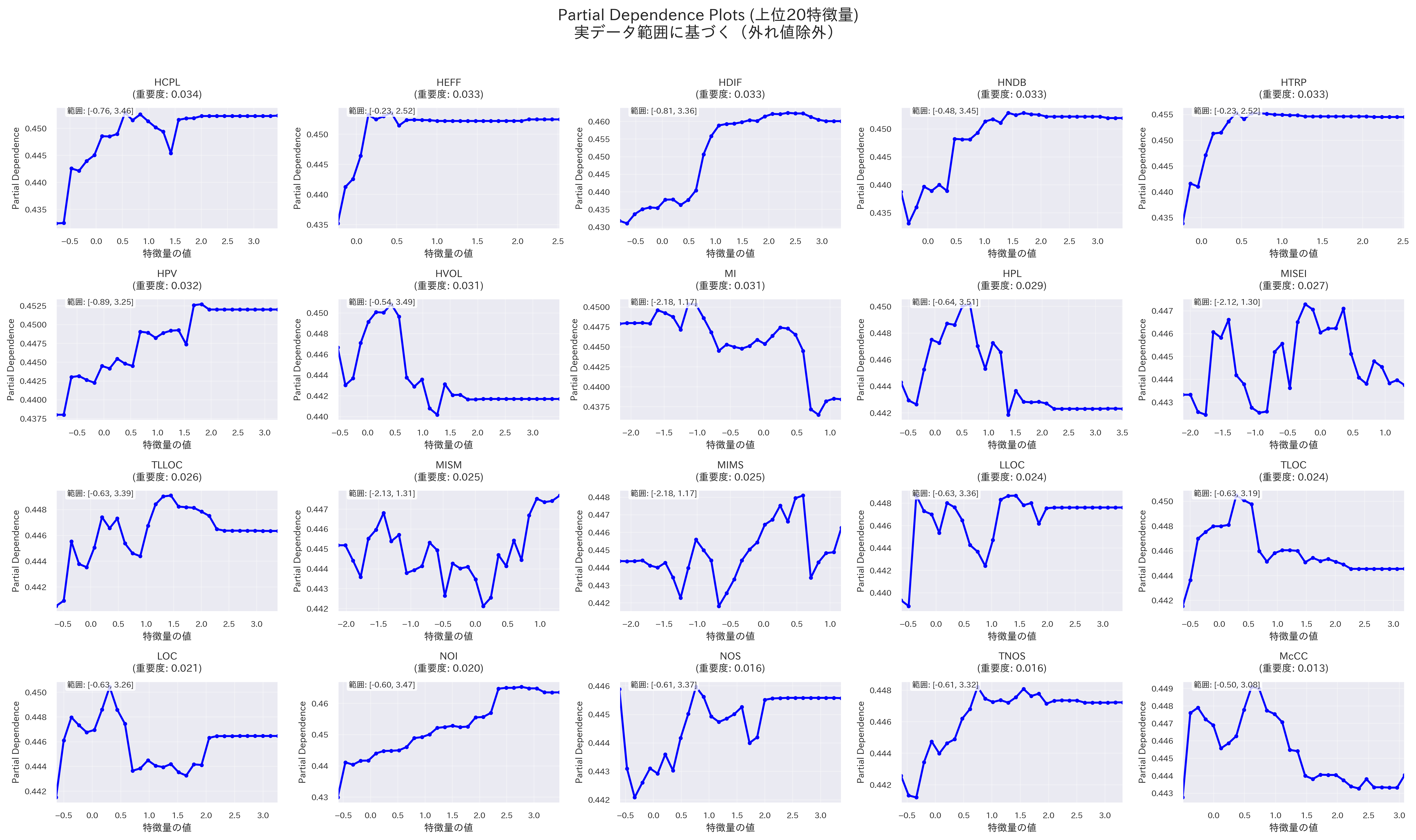 - Maintainability Index関連のメトリクス、一部のハルステッドメトリクス(HCPL、HVOL、HDIF、HPL、HPV)は凹型のグラフになっており、特定の値付近で陽性クラスの予測確率が低くなり、その前後で陽性クラスの予測確率が高くなっている