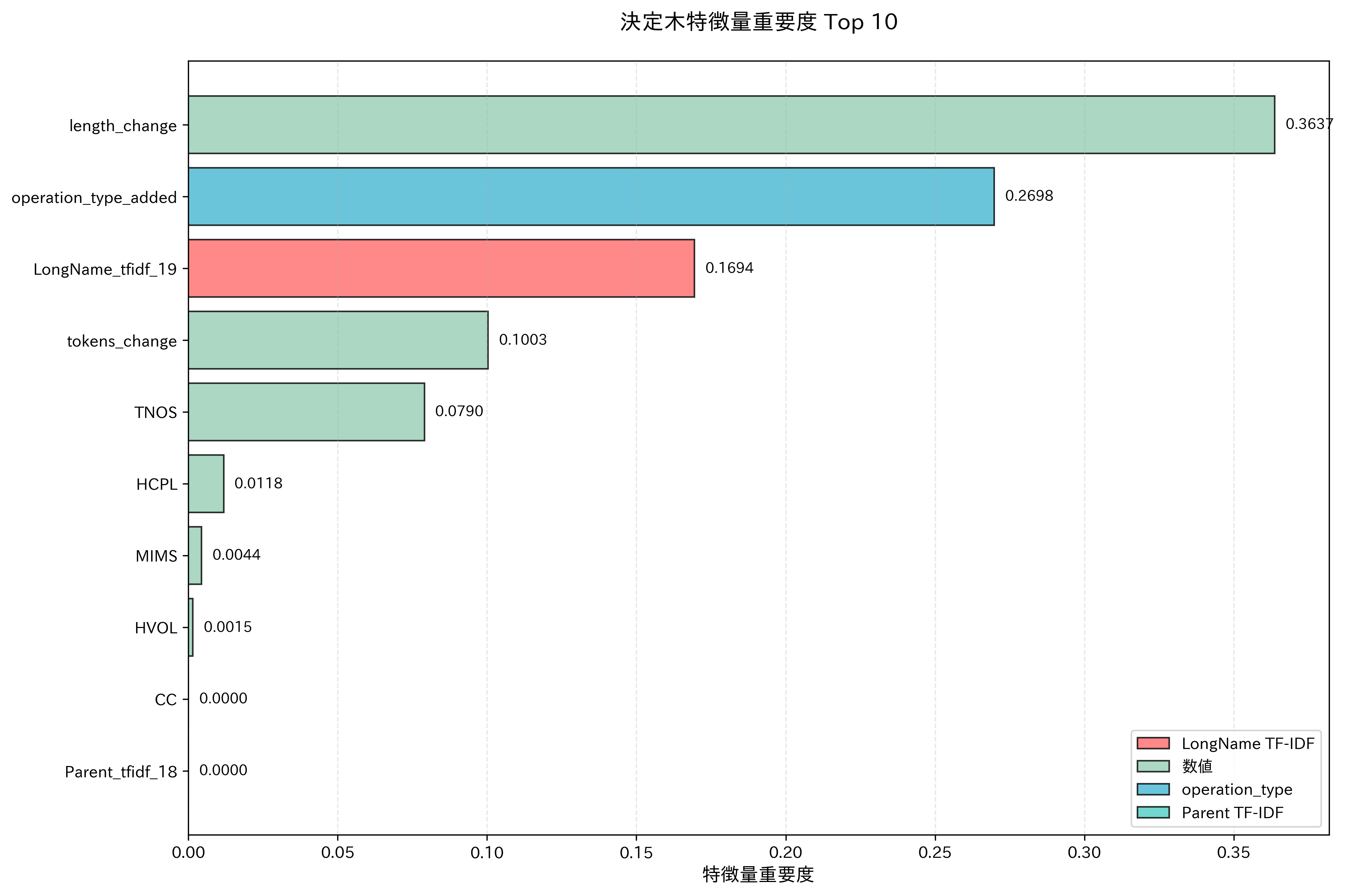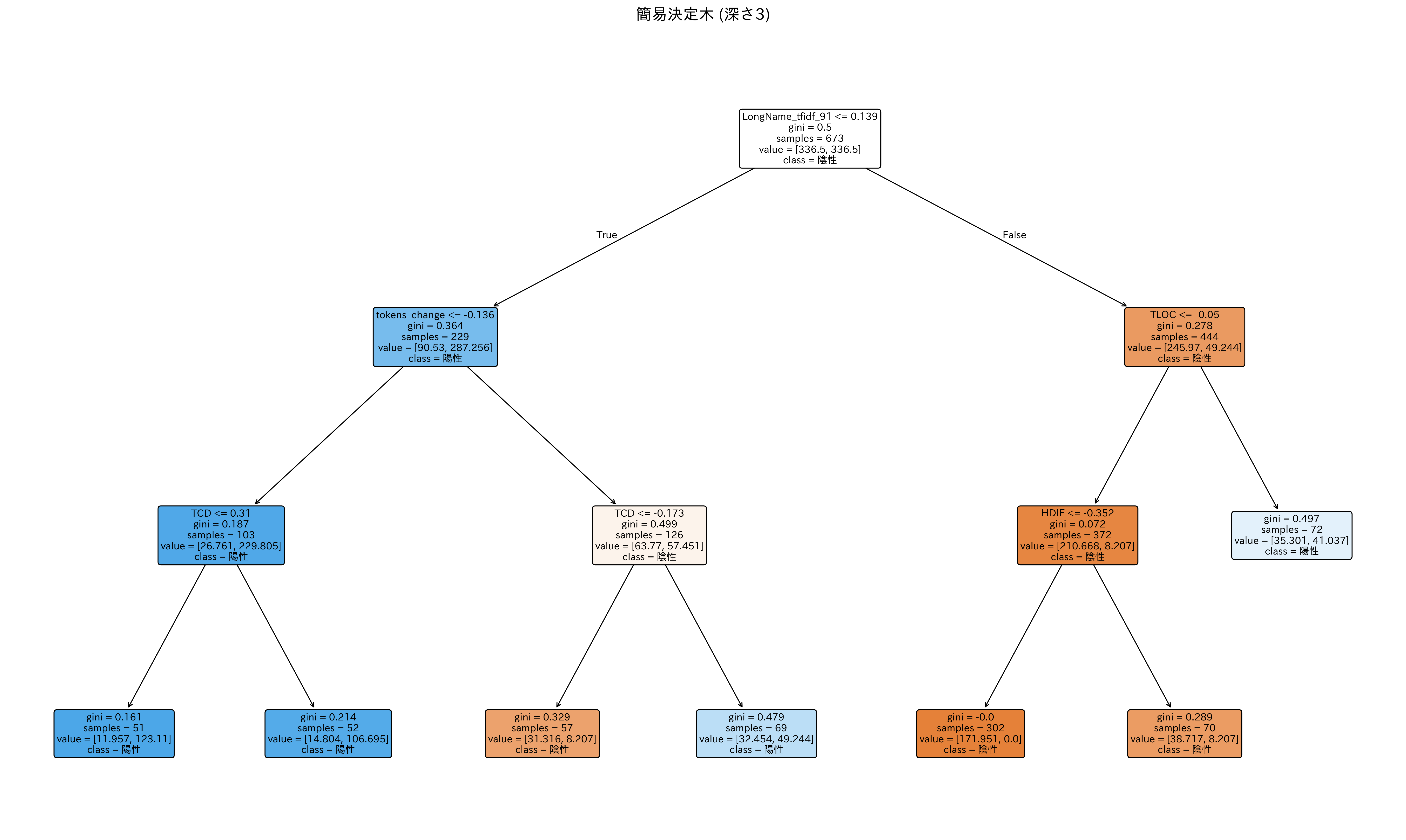 - コード行数の変化量が-0.037以下 -> メソッド操作が「追加」 -> LongNameに含まれる特定の単語の重要度が0.339以下ではないときにジニ不純度がおよそ0.22となり、陽性クラスを高い確率で分類している
