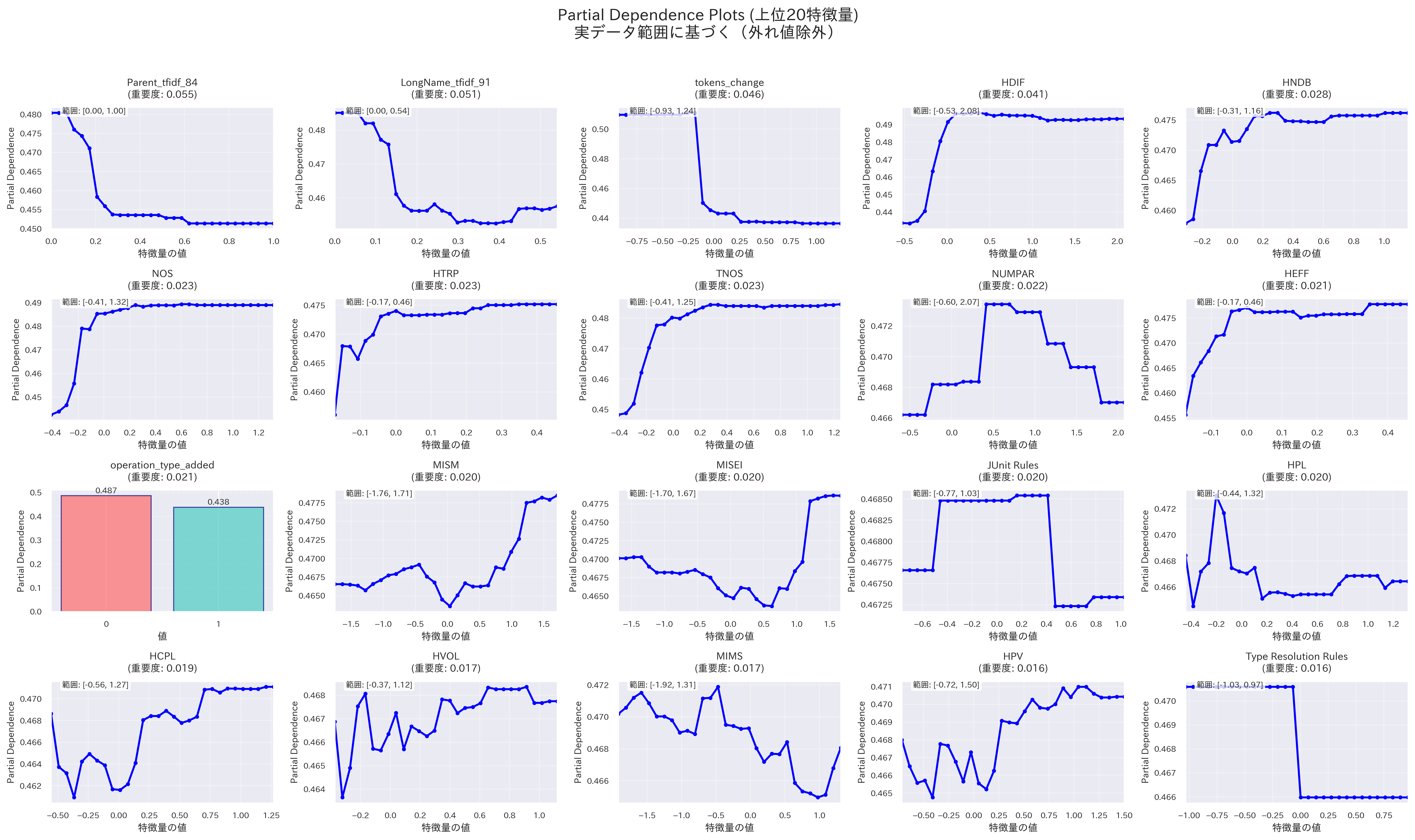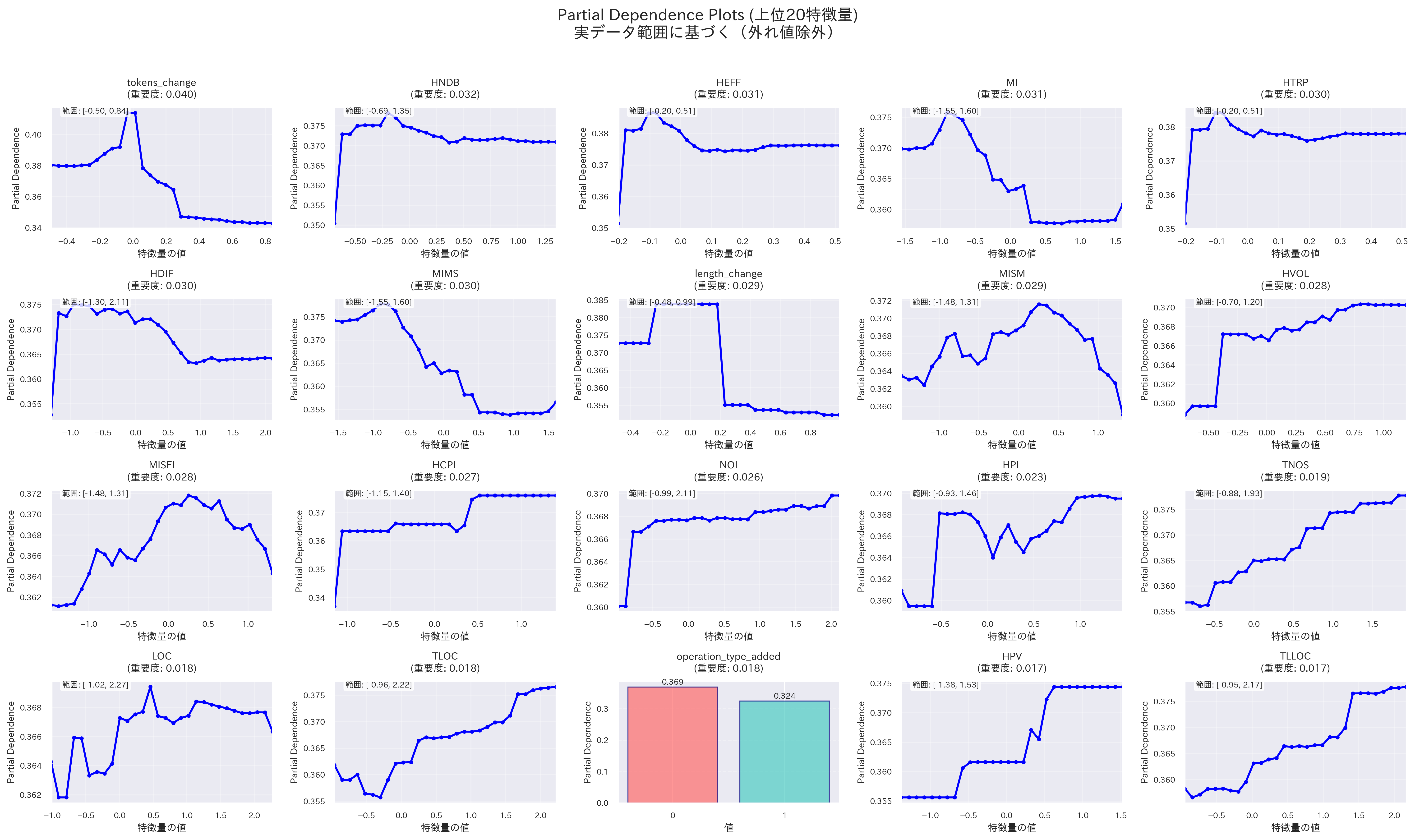 - Partial Dependence Plotを見ると、いずれの特徴量においても、Partial Dependenceが0.5を超える領域がほとんどない