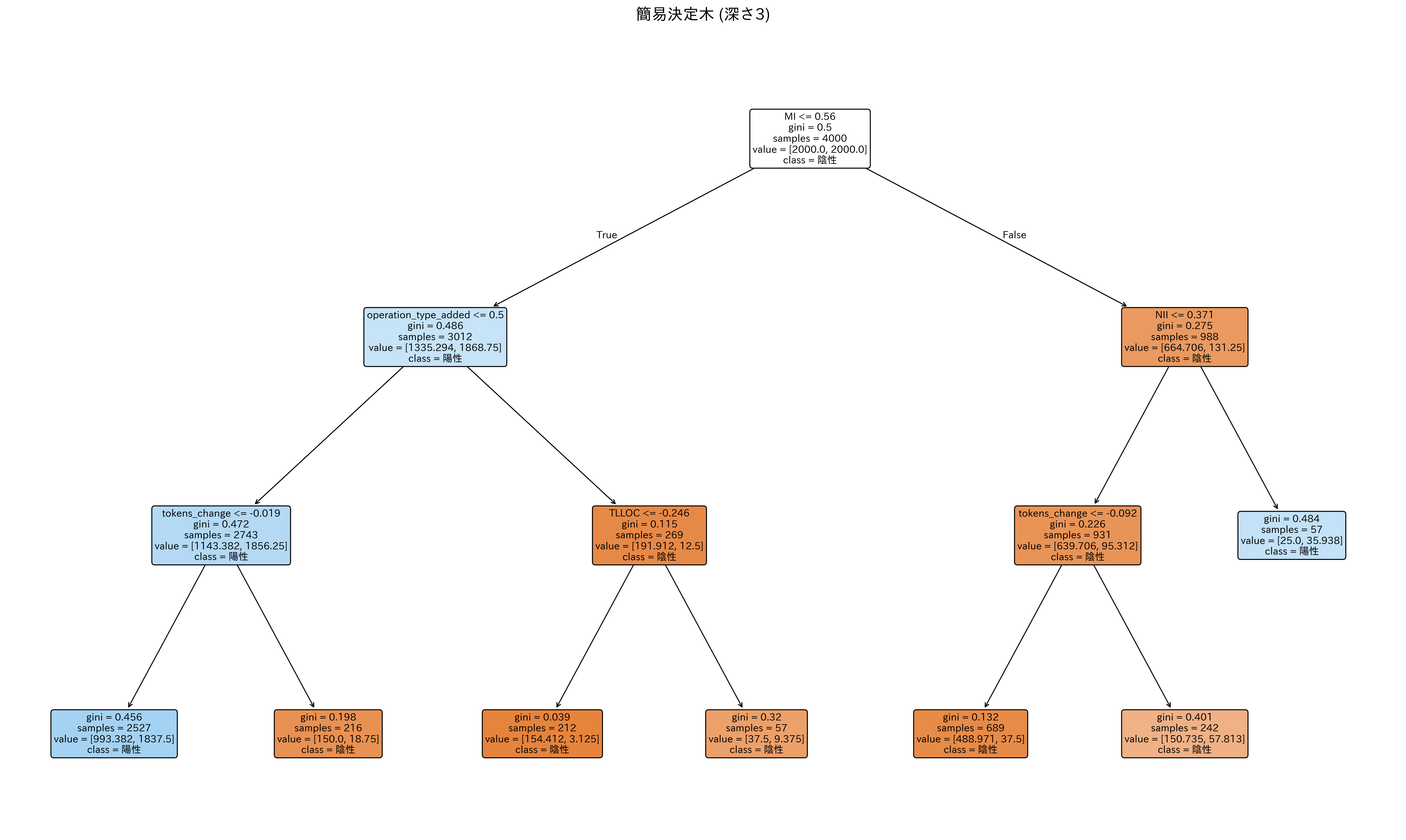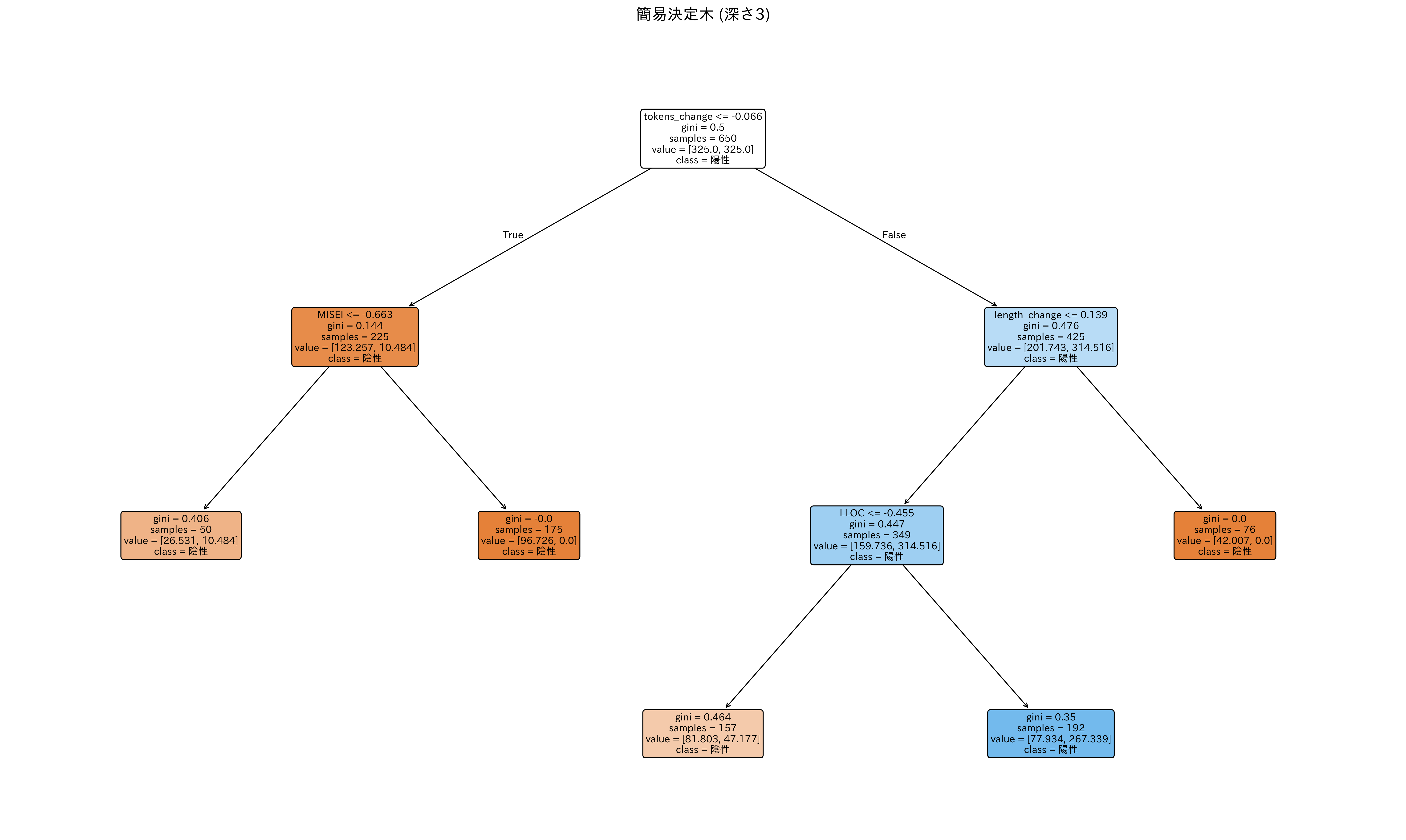 - トークン数の変化量が-0.066以下ではない -> コード行数の変化量が0.139以下ではないときにジニ不純度が0となり、陰性クラスを高い確率で分類している