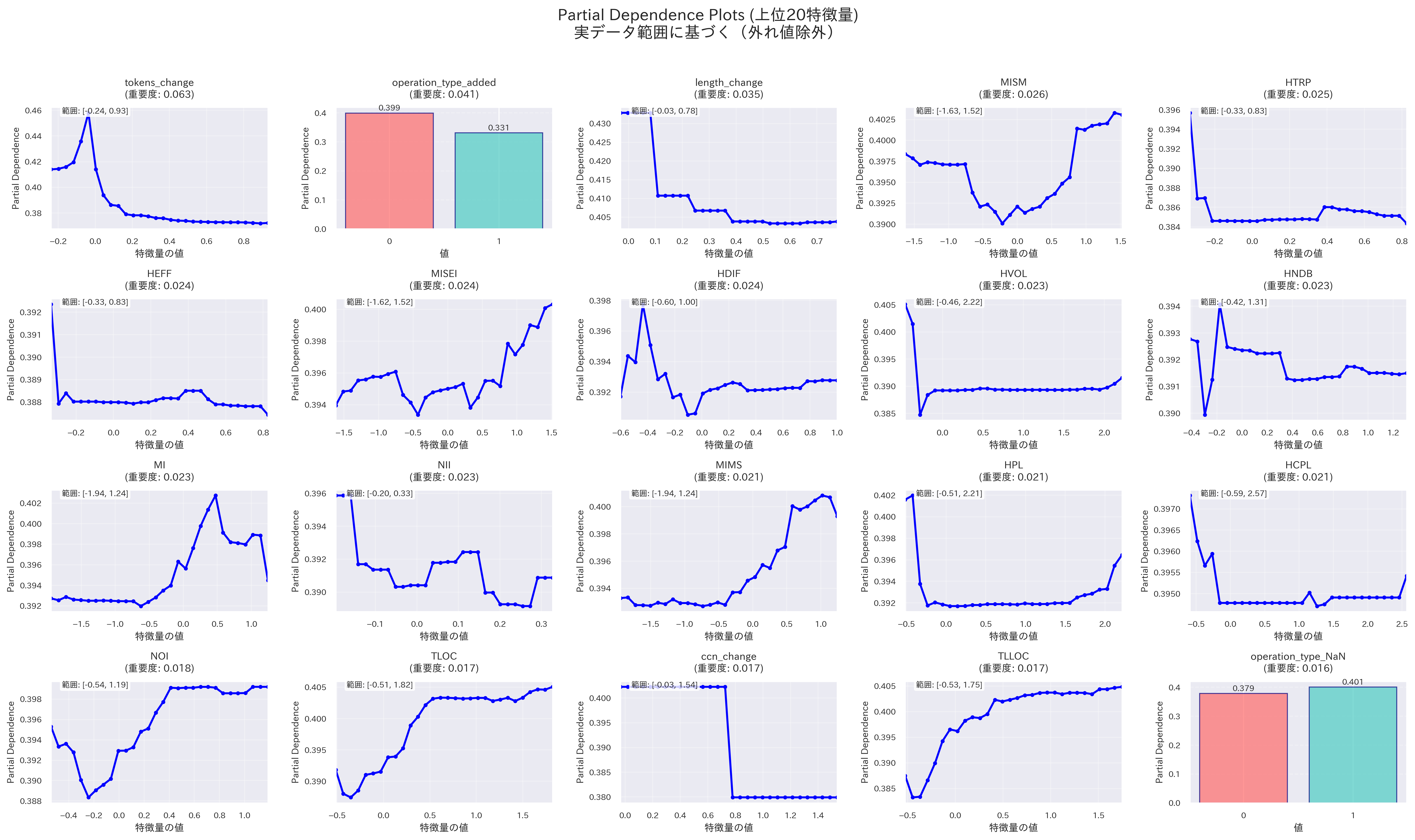 - コード行数の変化、トークン数の変化、HNDB、HTRP、HEFFのいずれかの値を変化させても、陽性クラスの予測確率にはあまり変化が見られない
