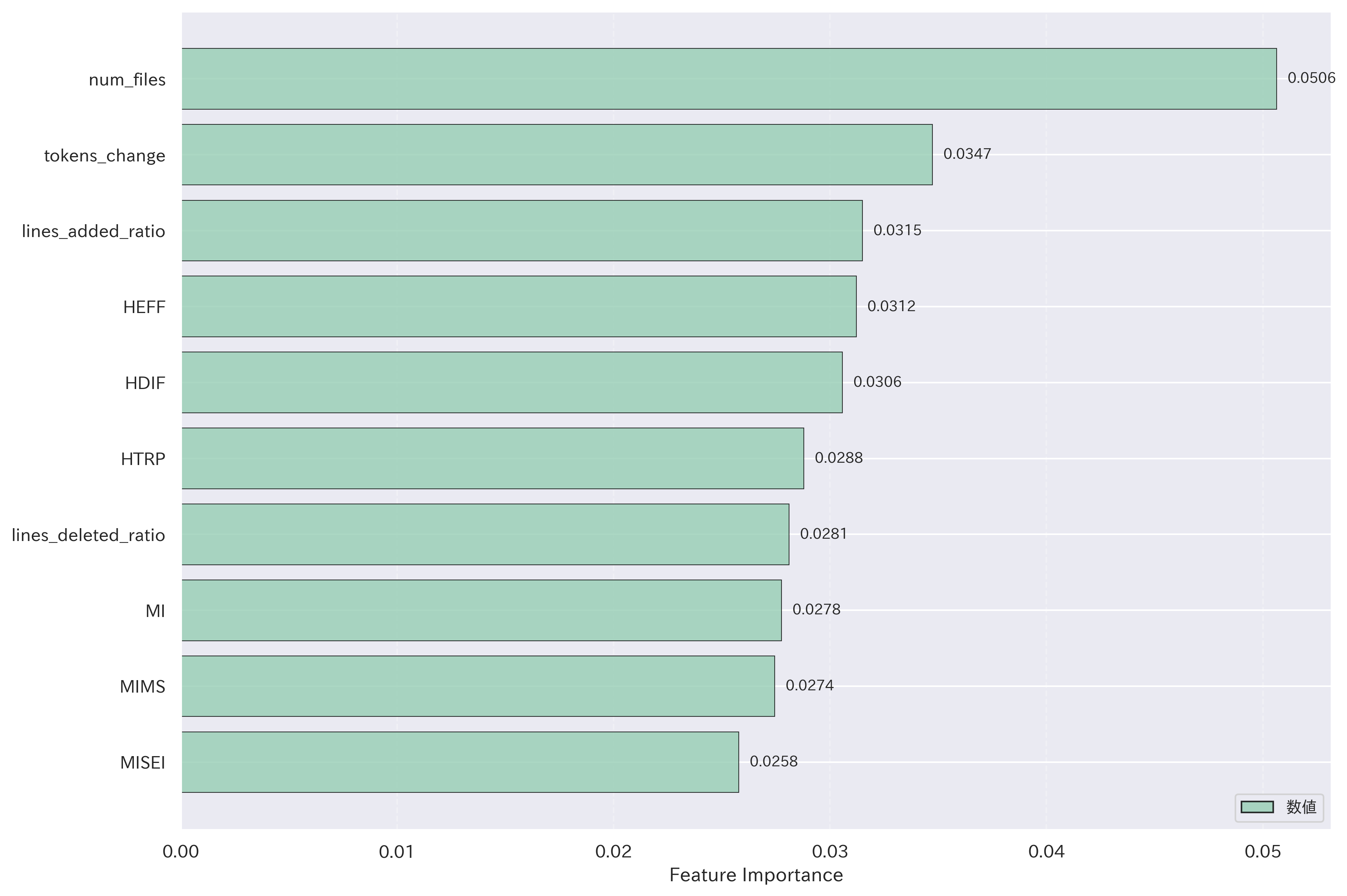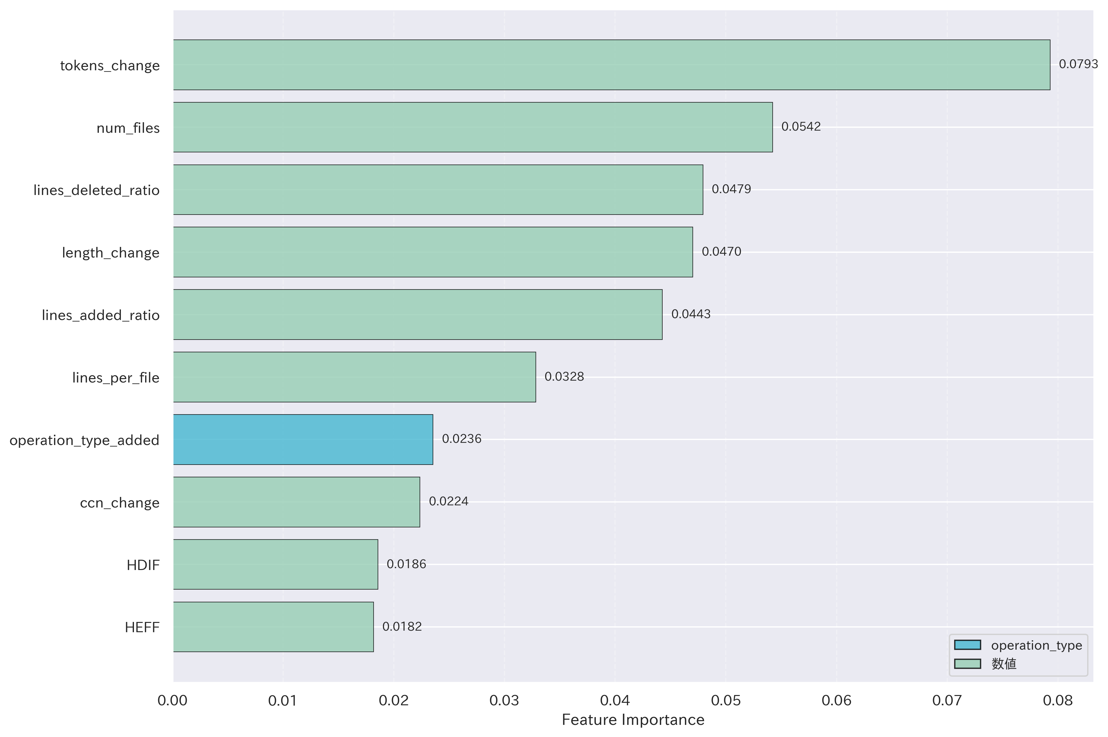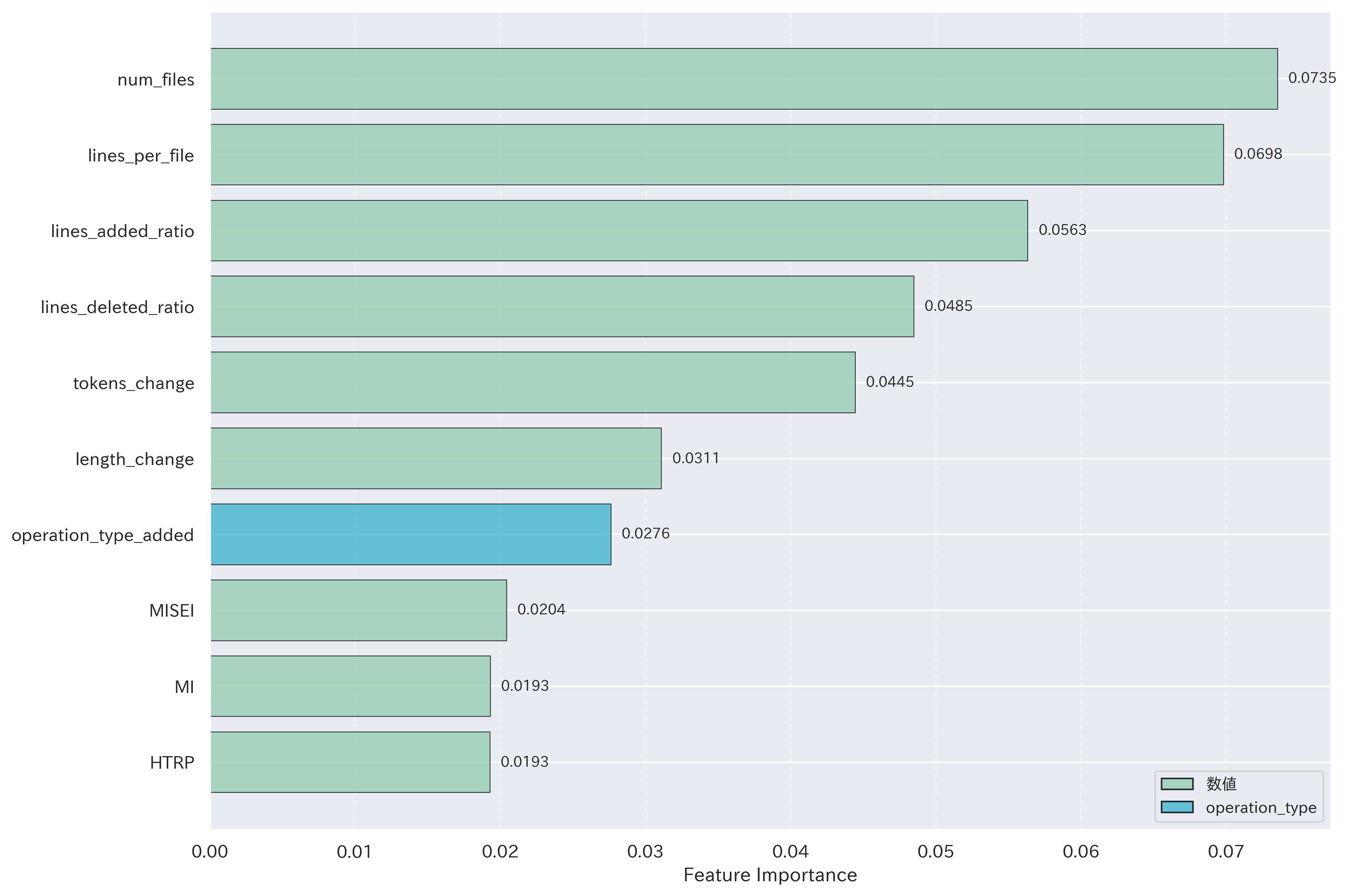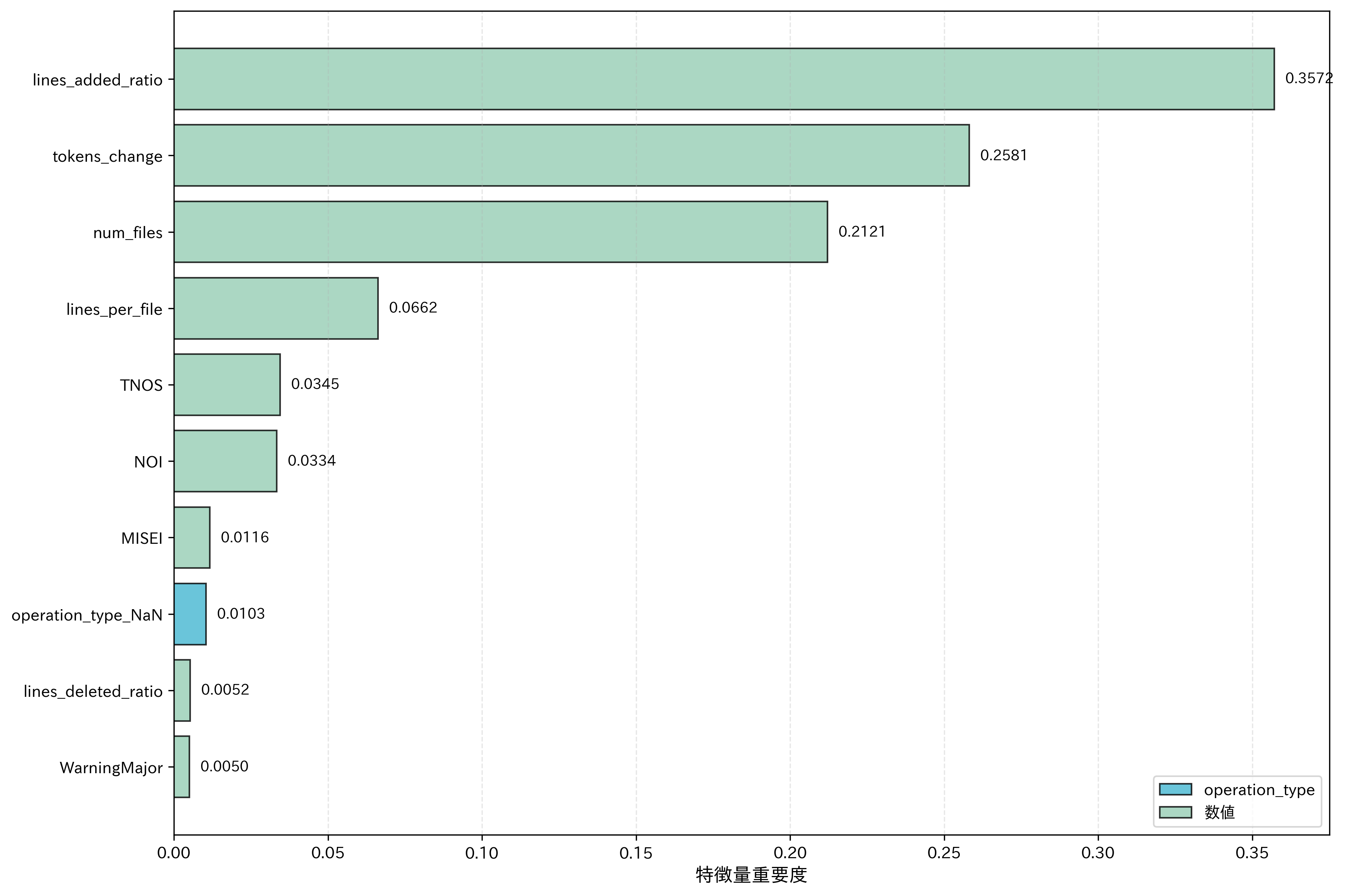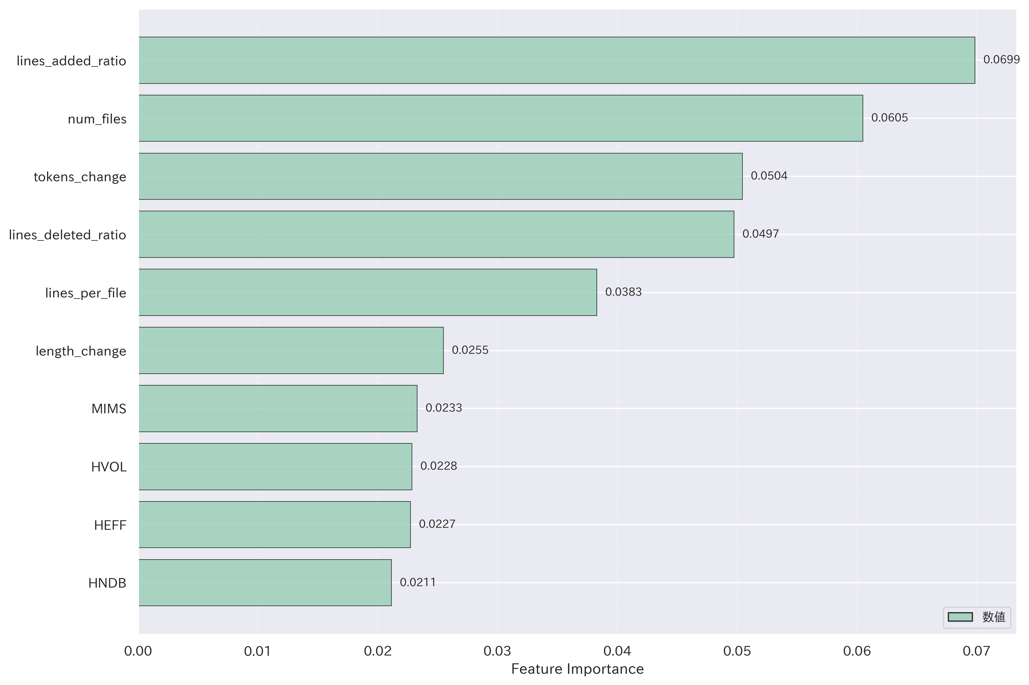 - 変更されたファイル数、トークン数の変化量、変更対象となったファイルの平均行数に加え、追加されたコード行数の割合(lines_added_ratio)、削除されたコード行数の割合(lines_deleted_ratio)も重要度が高い