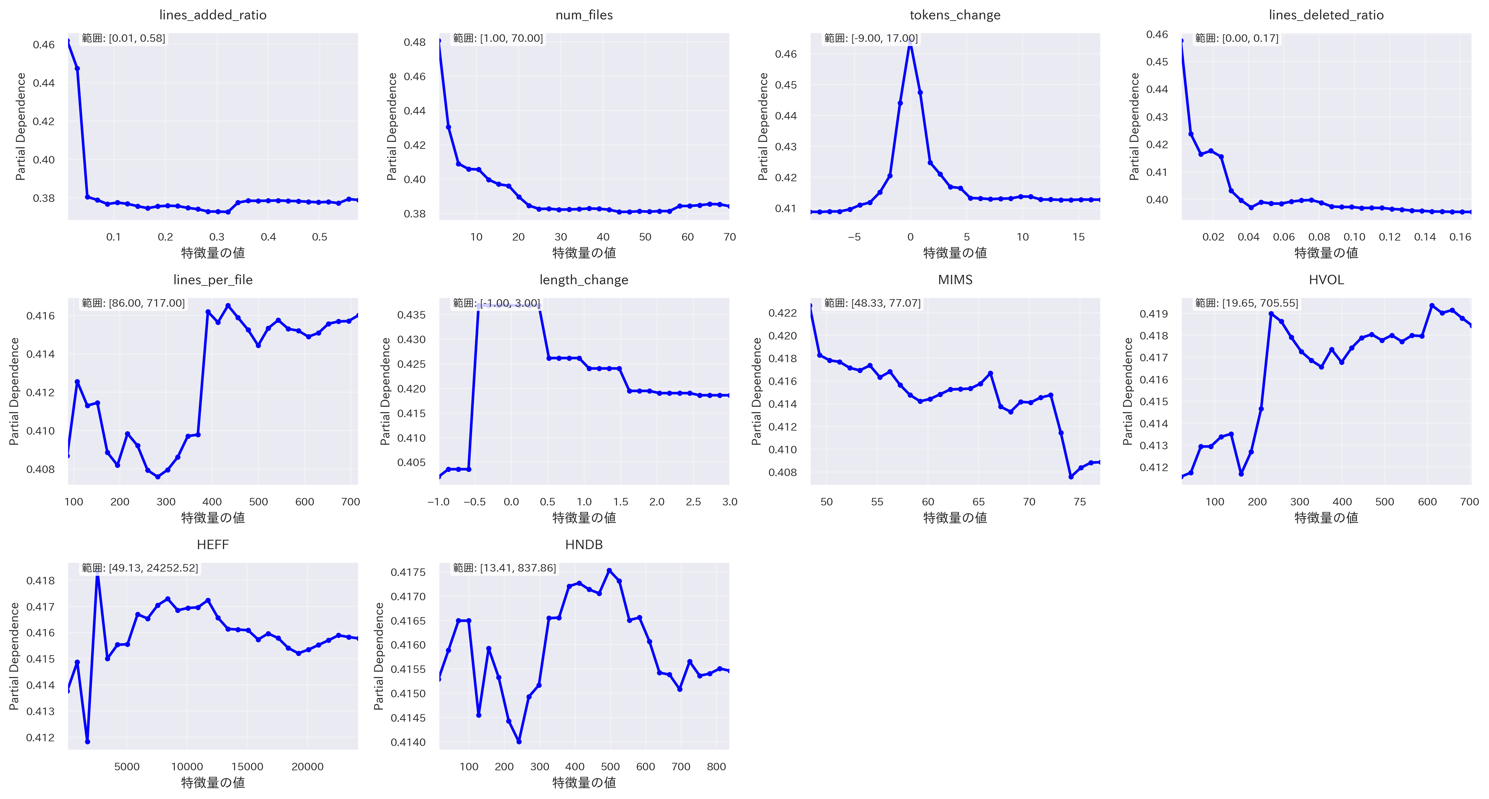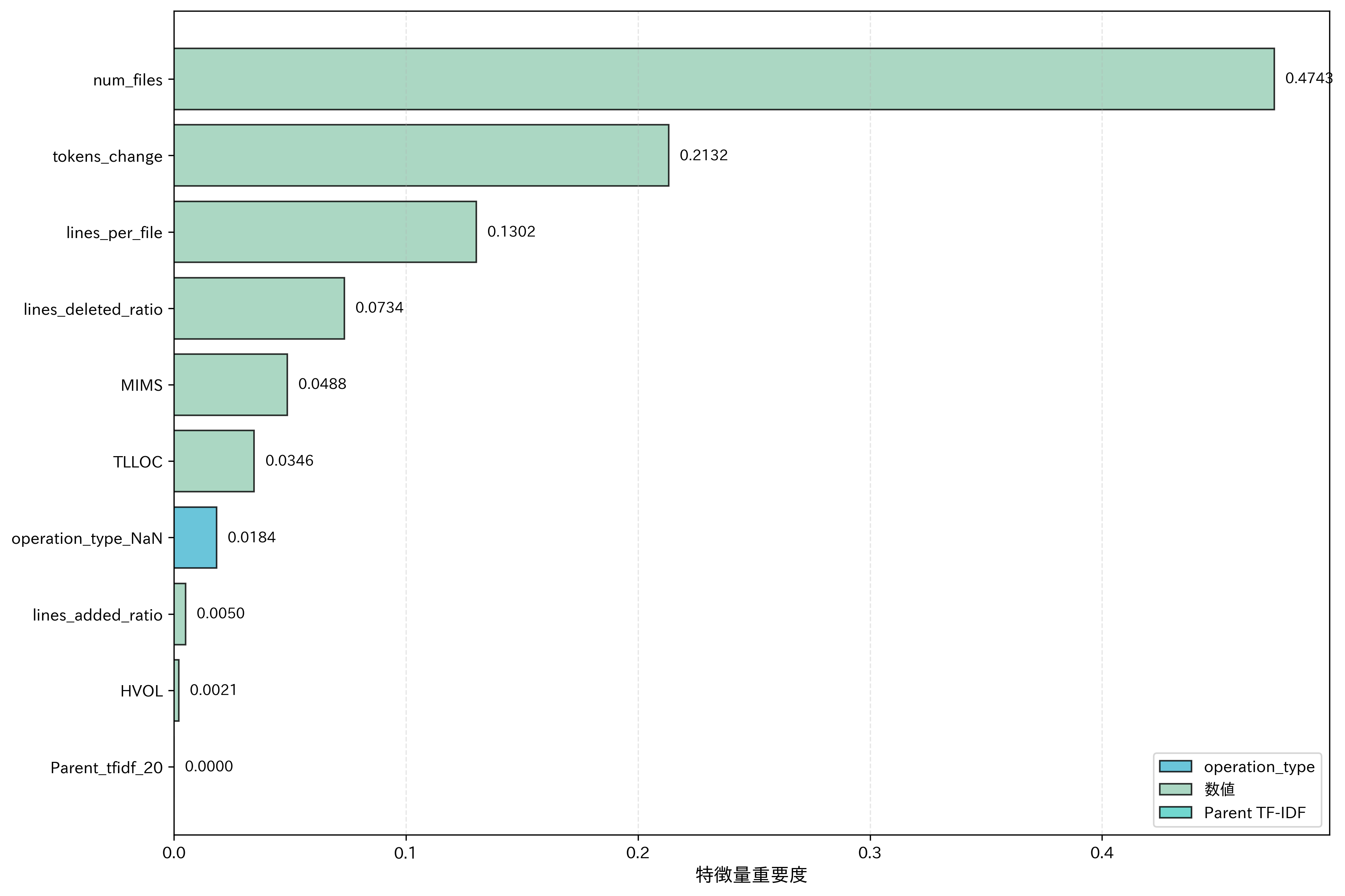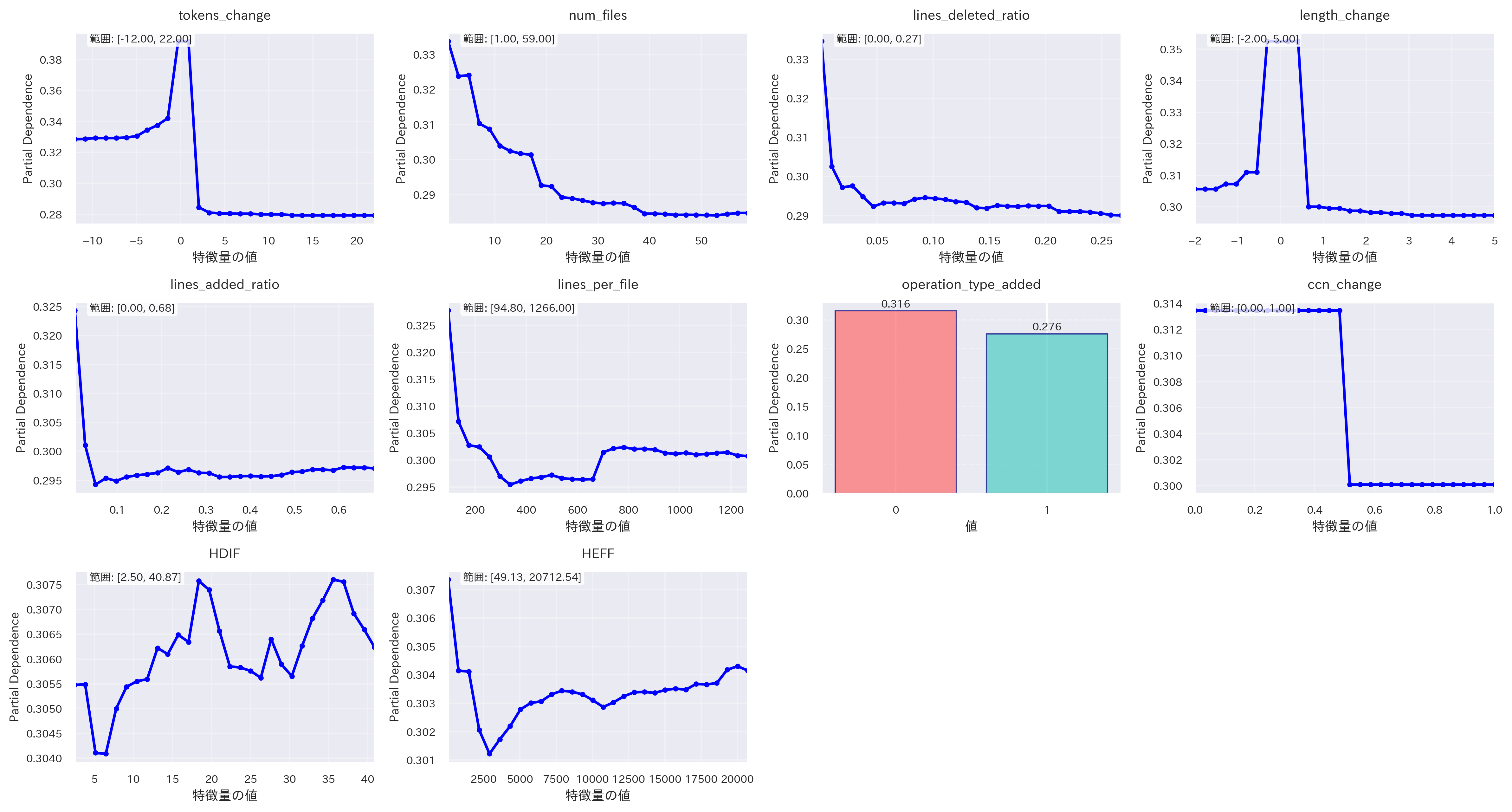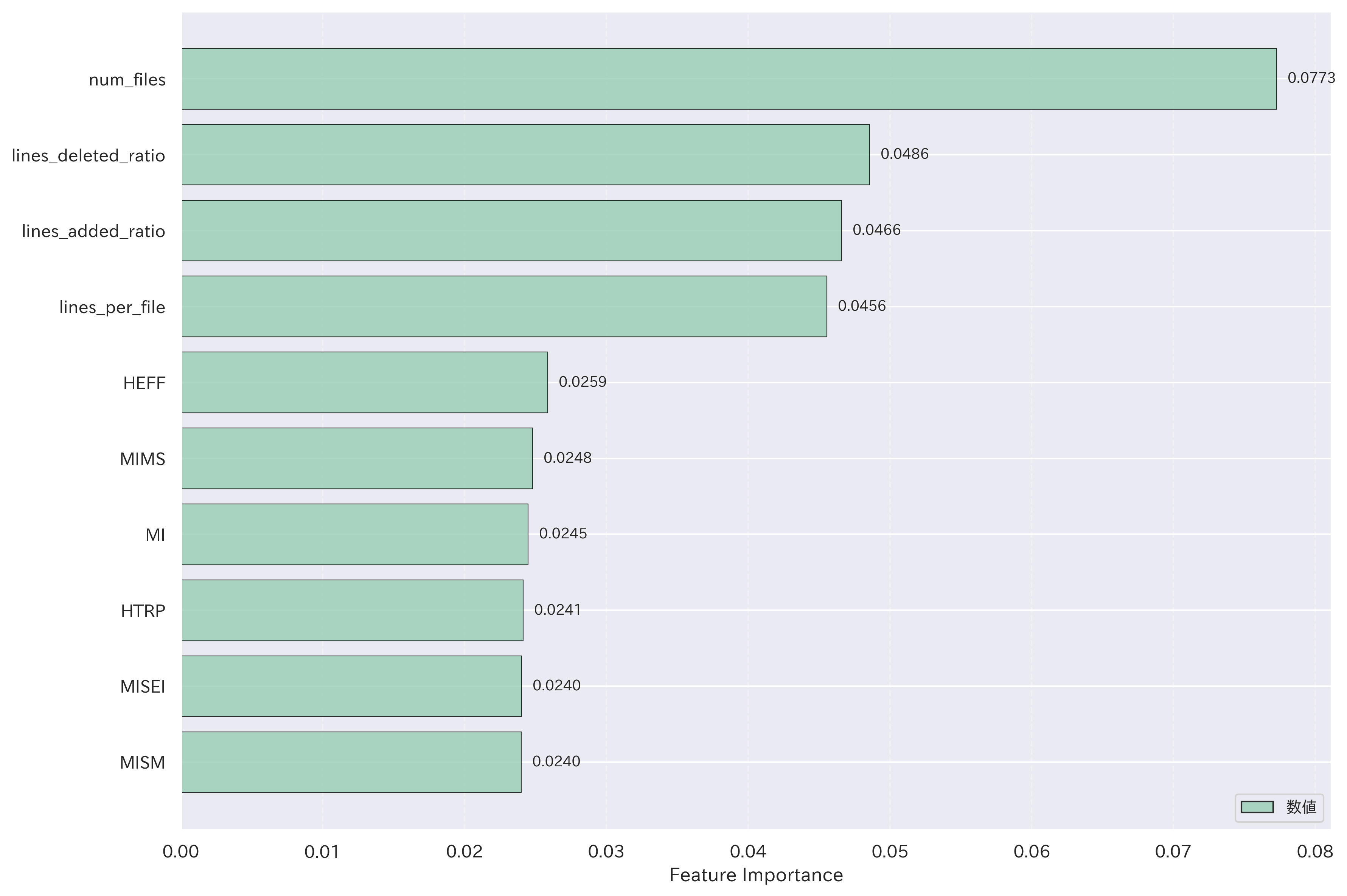 - 変更されたファイル数、トークン数の変化量、変更対象となったファイルの平均行数に加え、追加されたコード行数の割合(lines_added_ratio)、削除されたコード行数の割合(lines_deleted_ratio)も重要度が高い