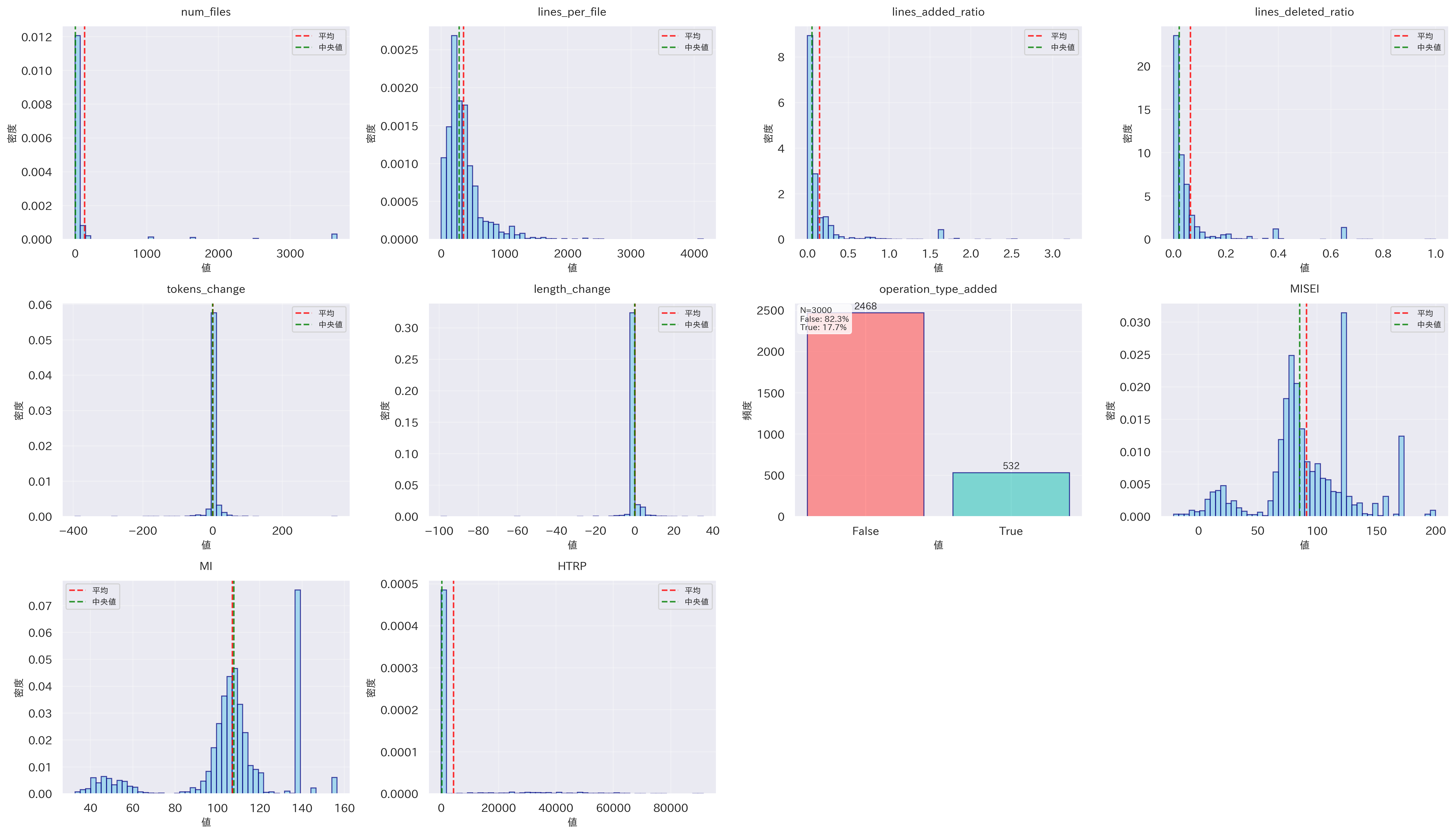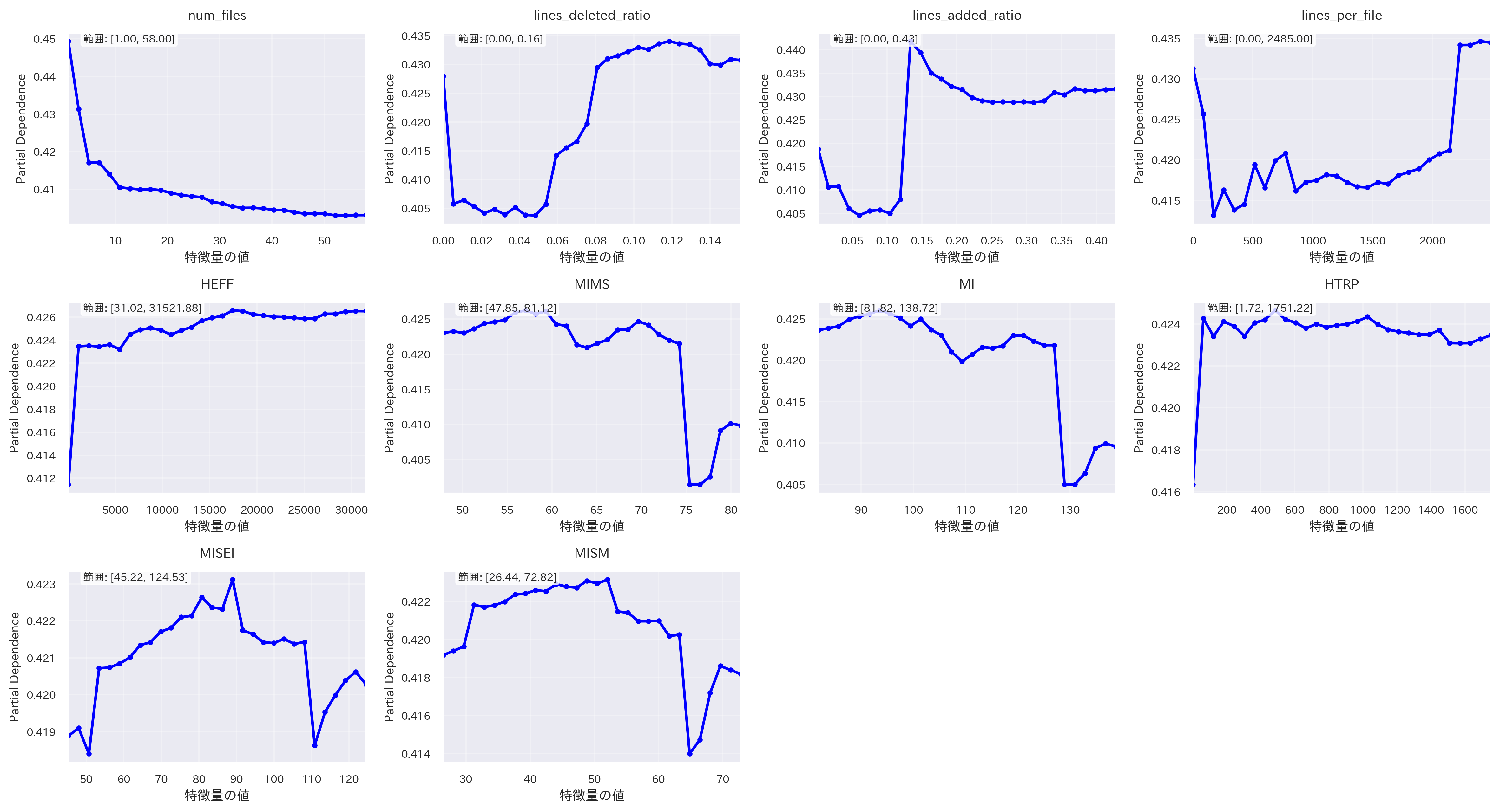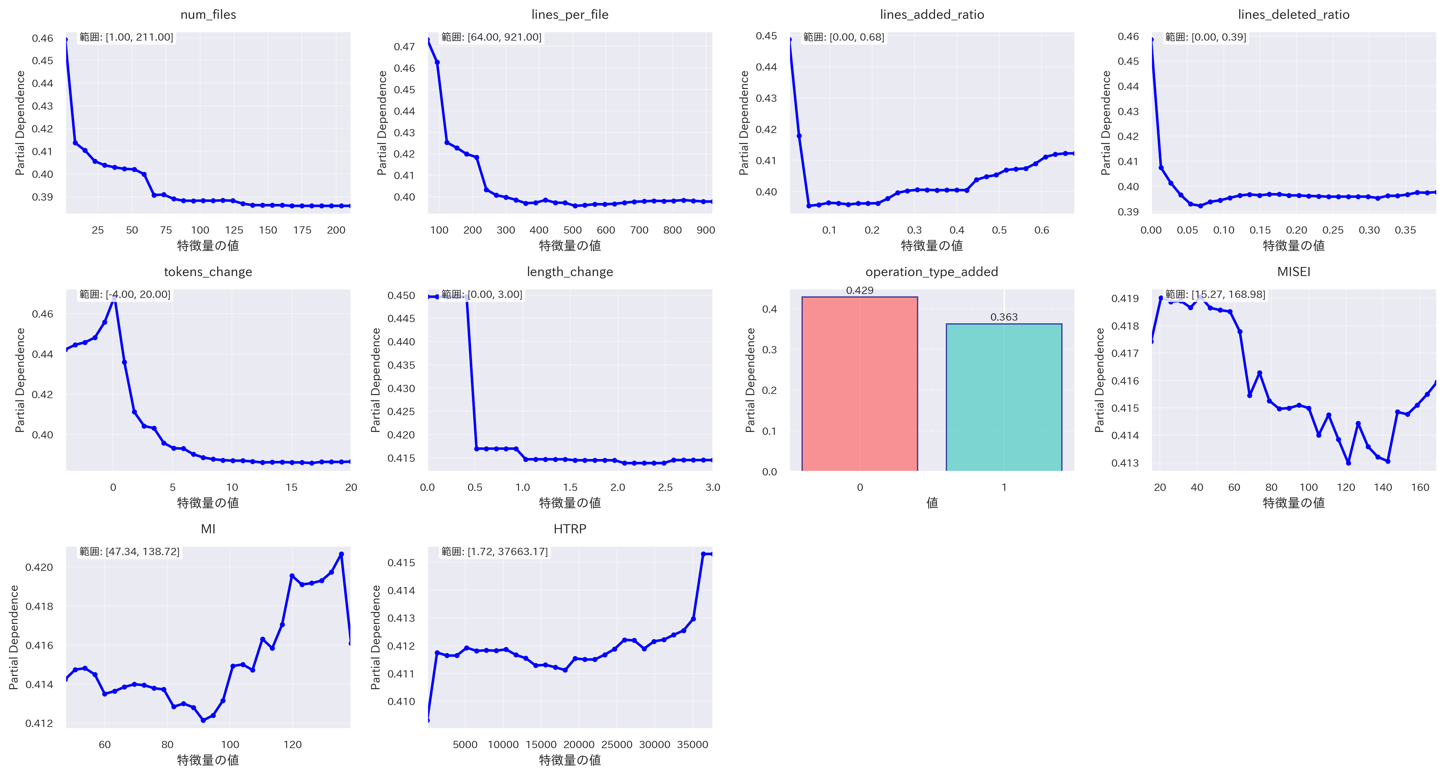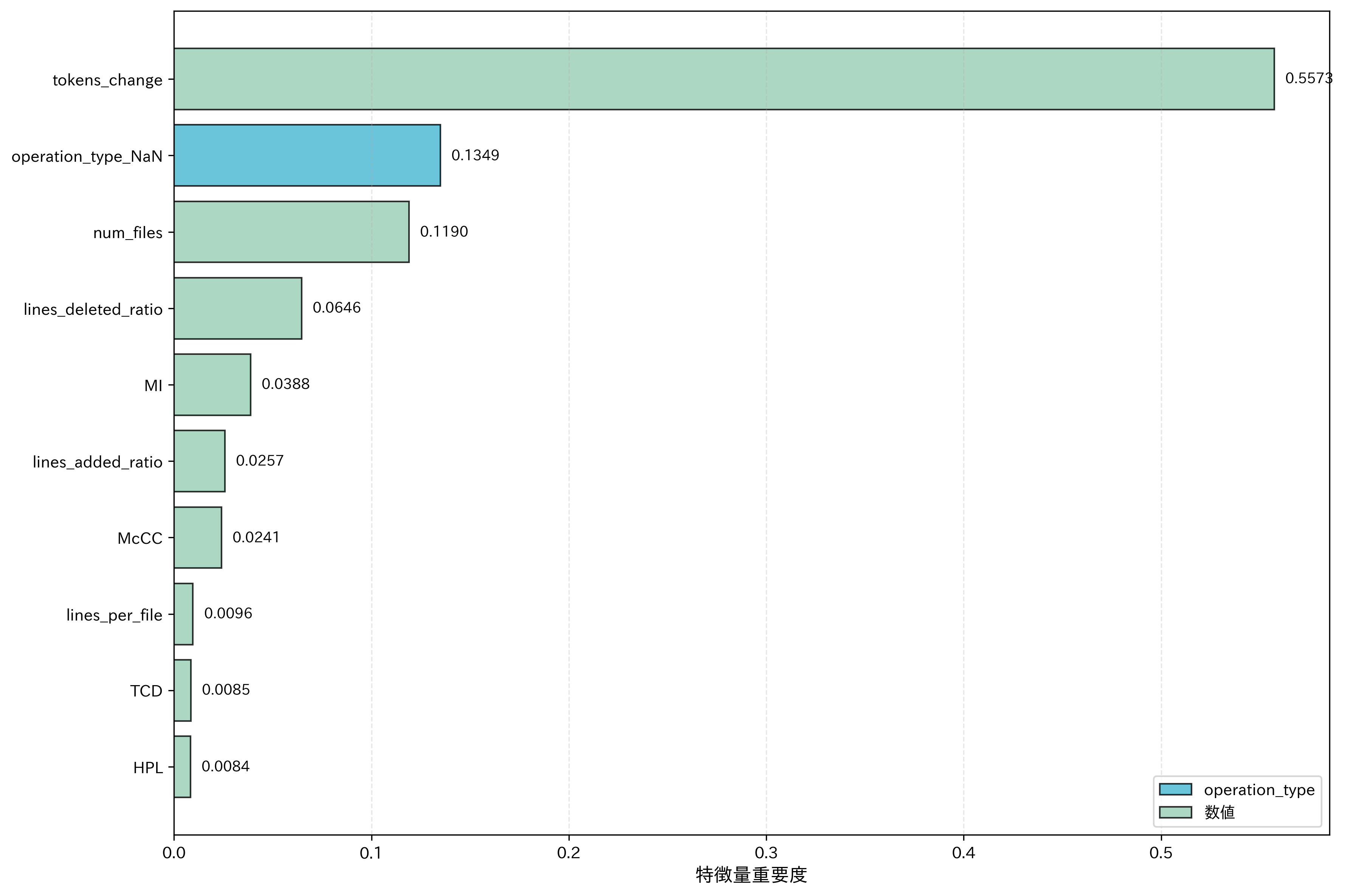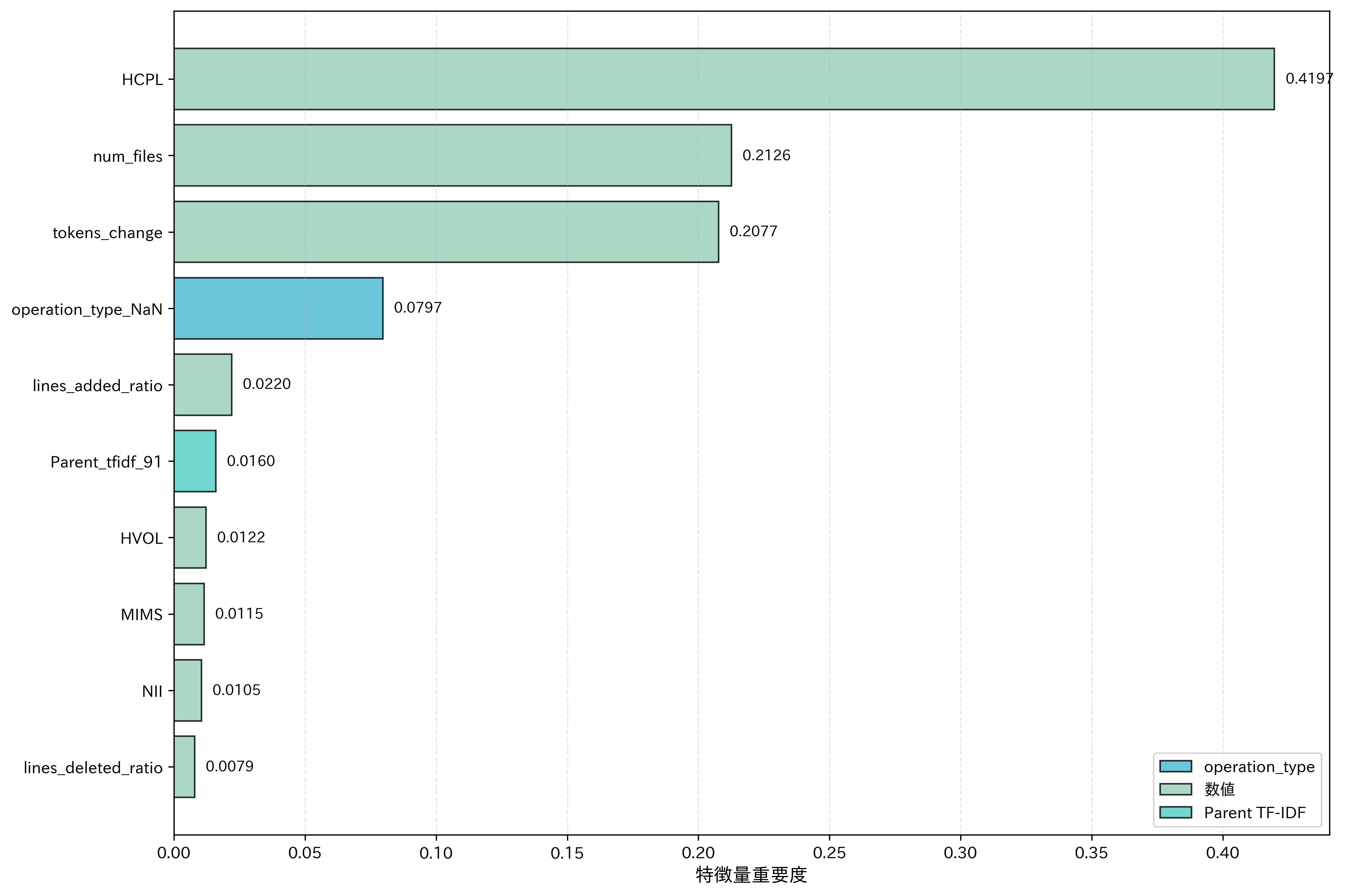 - 変更されたファイル数、トークン数の変化量、変更対象となったファイルの平均行数に加え、追加されたコード行数の割合(lines_added_ratio)、削除されたコード行数の割合(lines_deleted_ratio)も重要度が高い