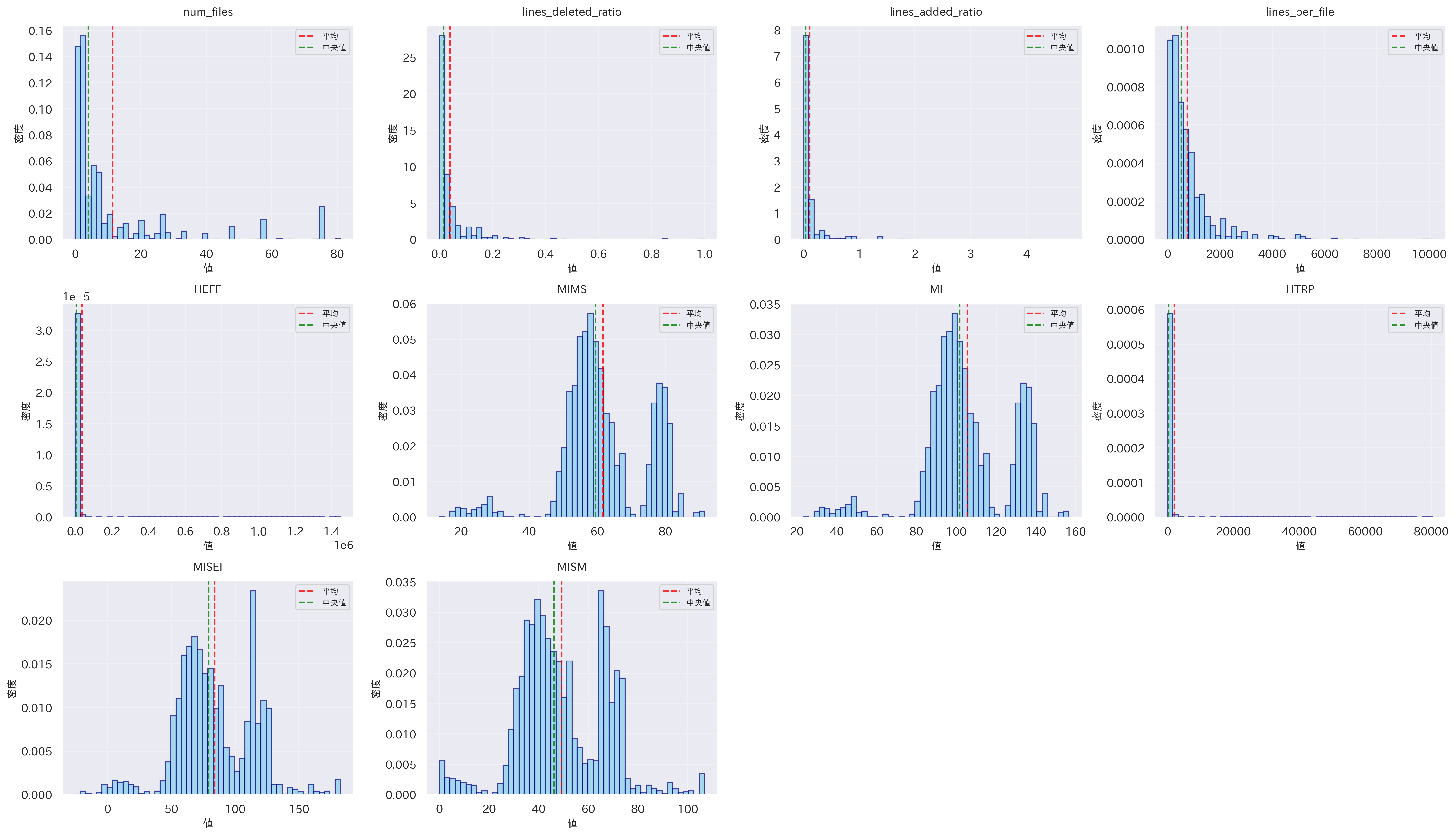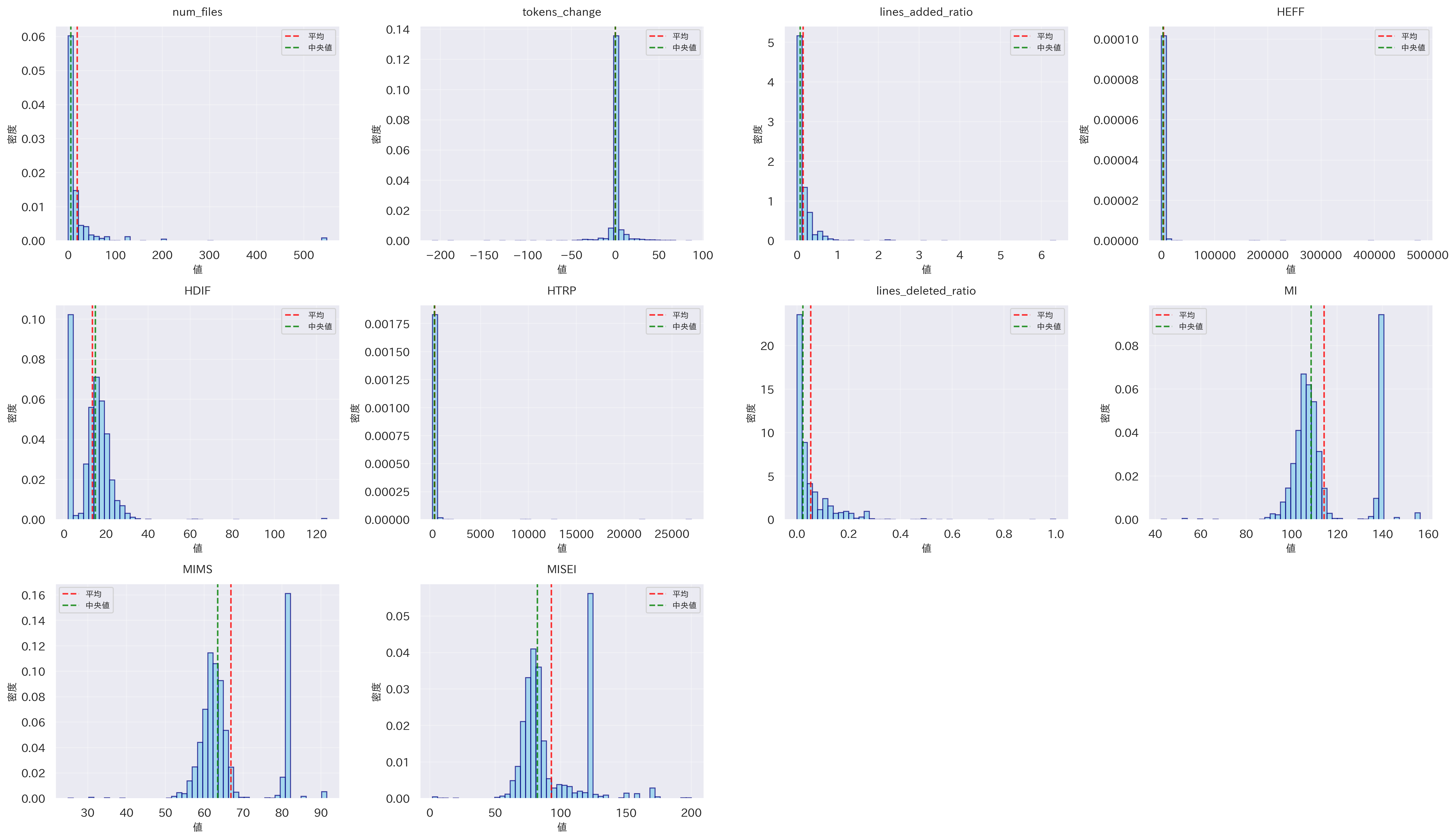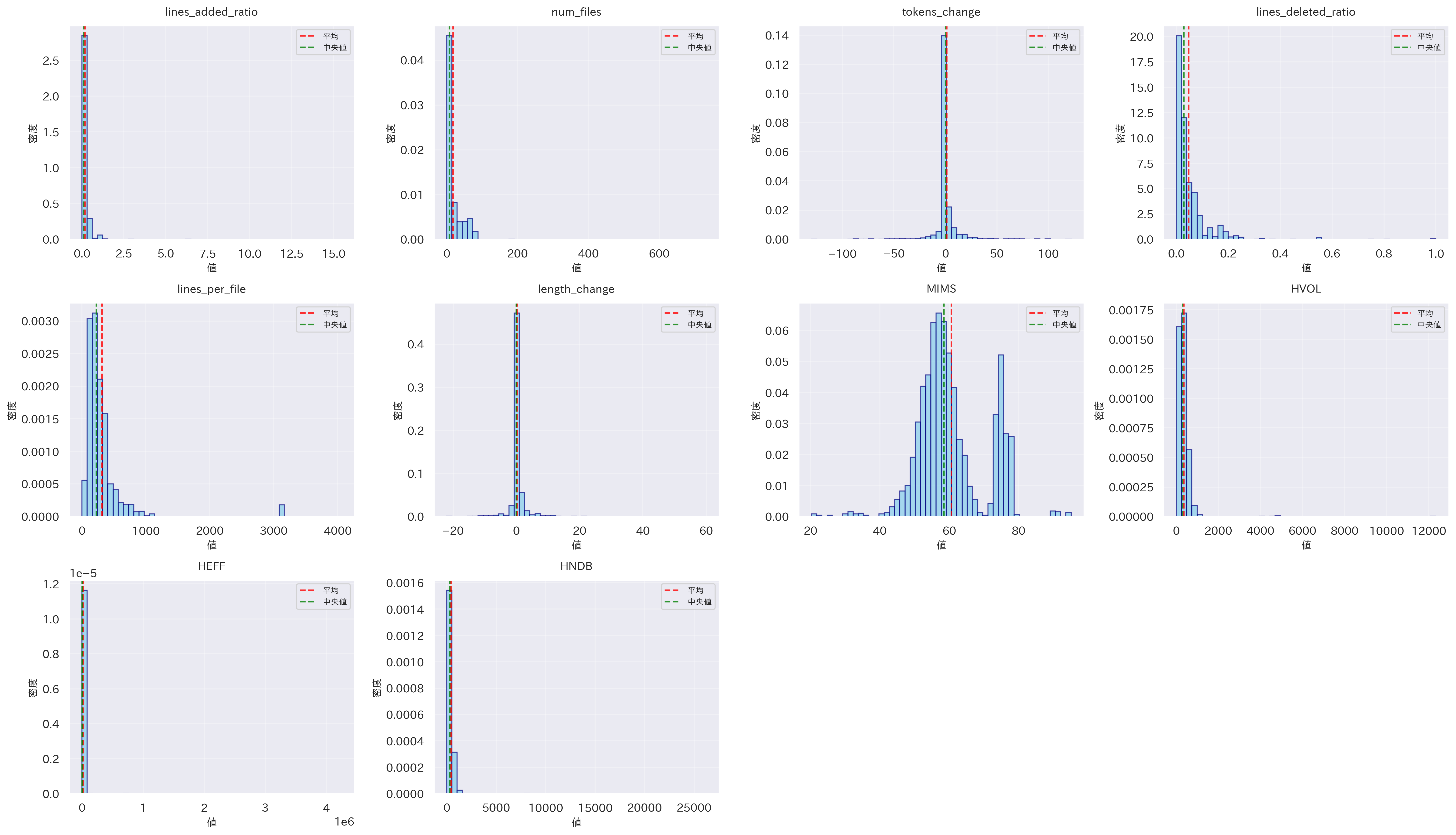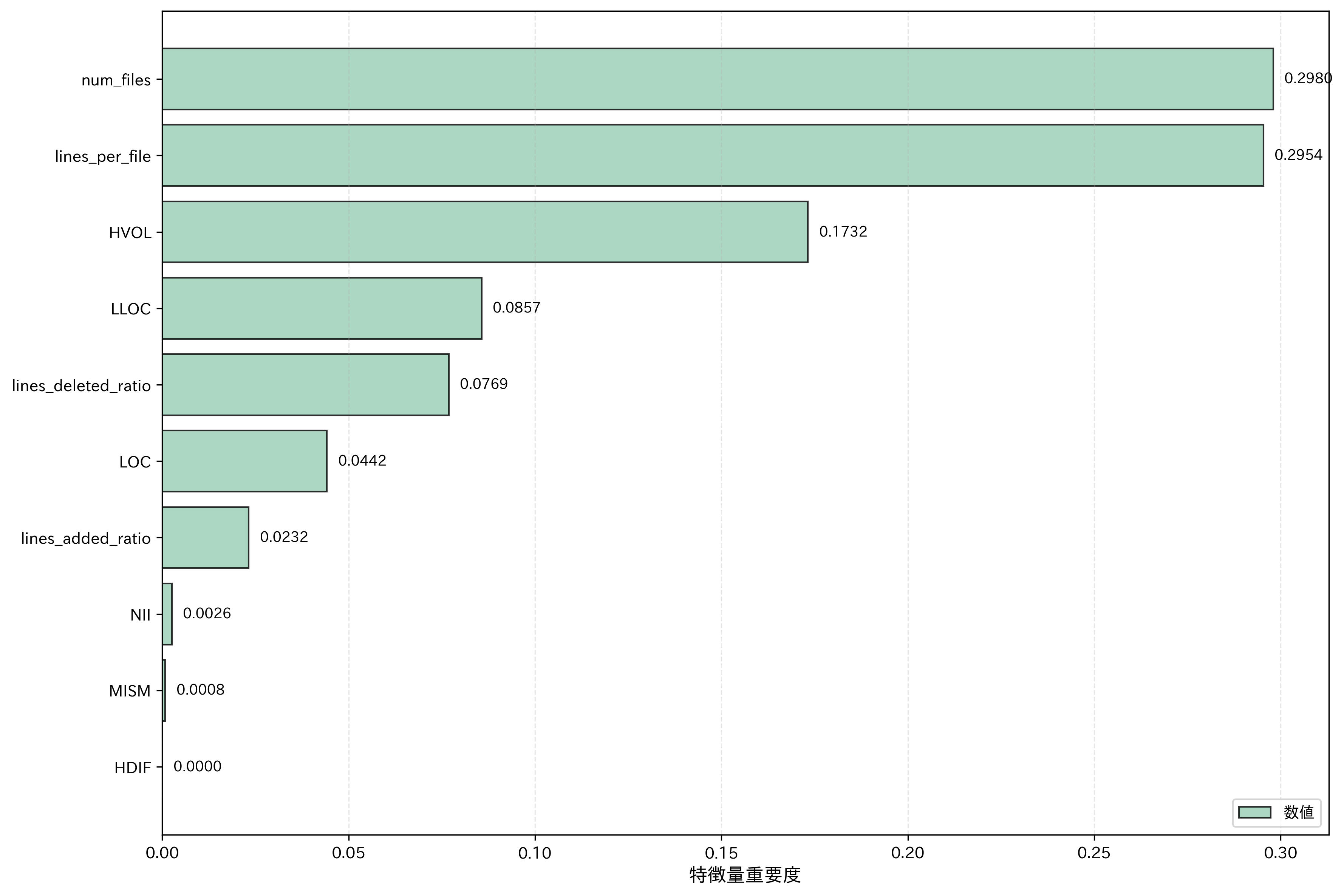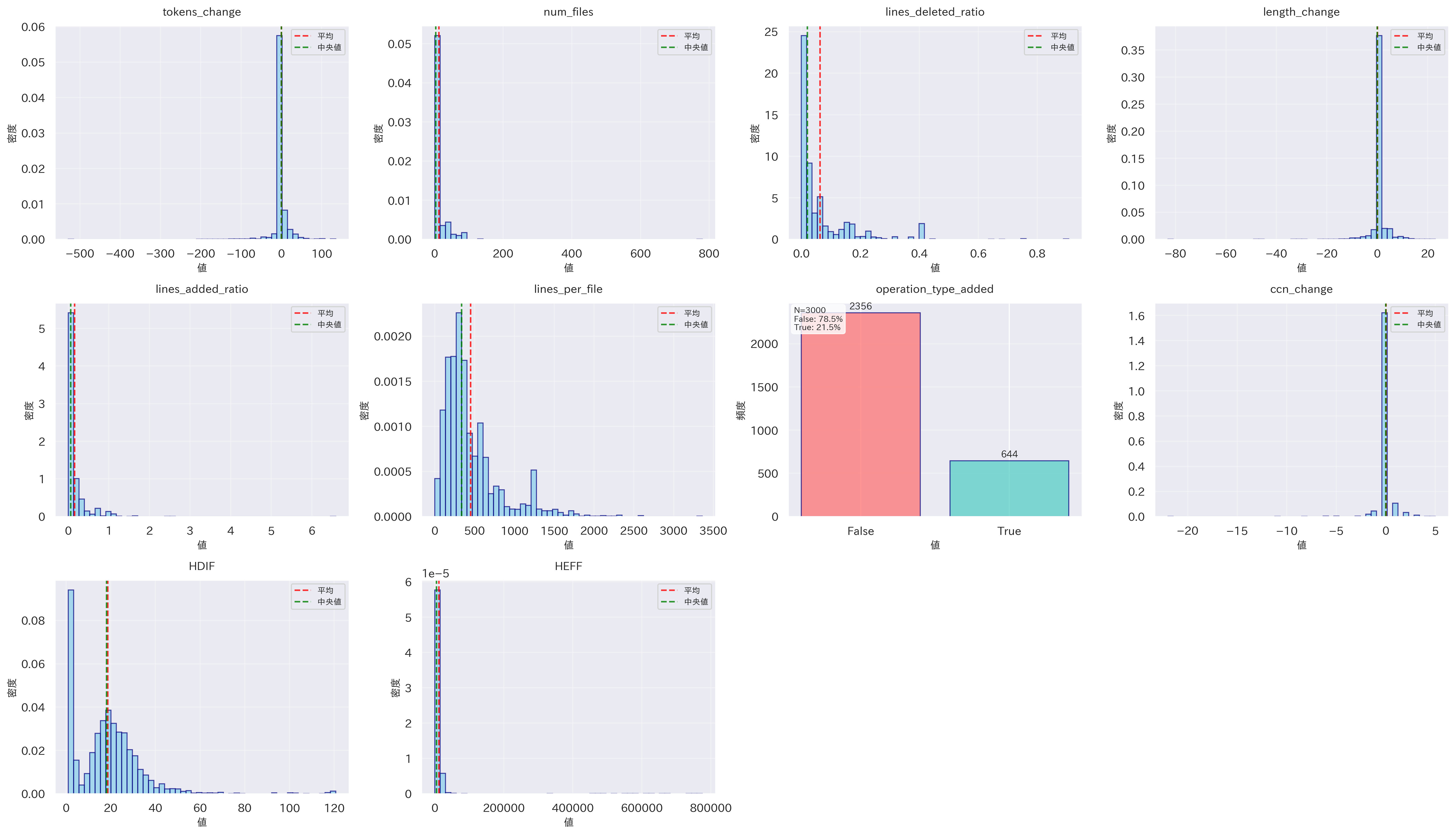 - 変更されたファイル数、トークン数の変化量、変更対象となったファイルの平均行数に加え、追加されたコード行数の割合(lines_added_ratio)、削除されたコード行数の割合(lines_deleted_ratio)も重要度が高い