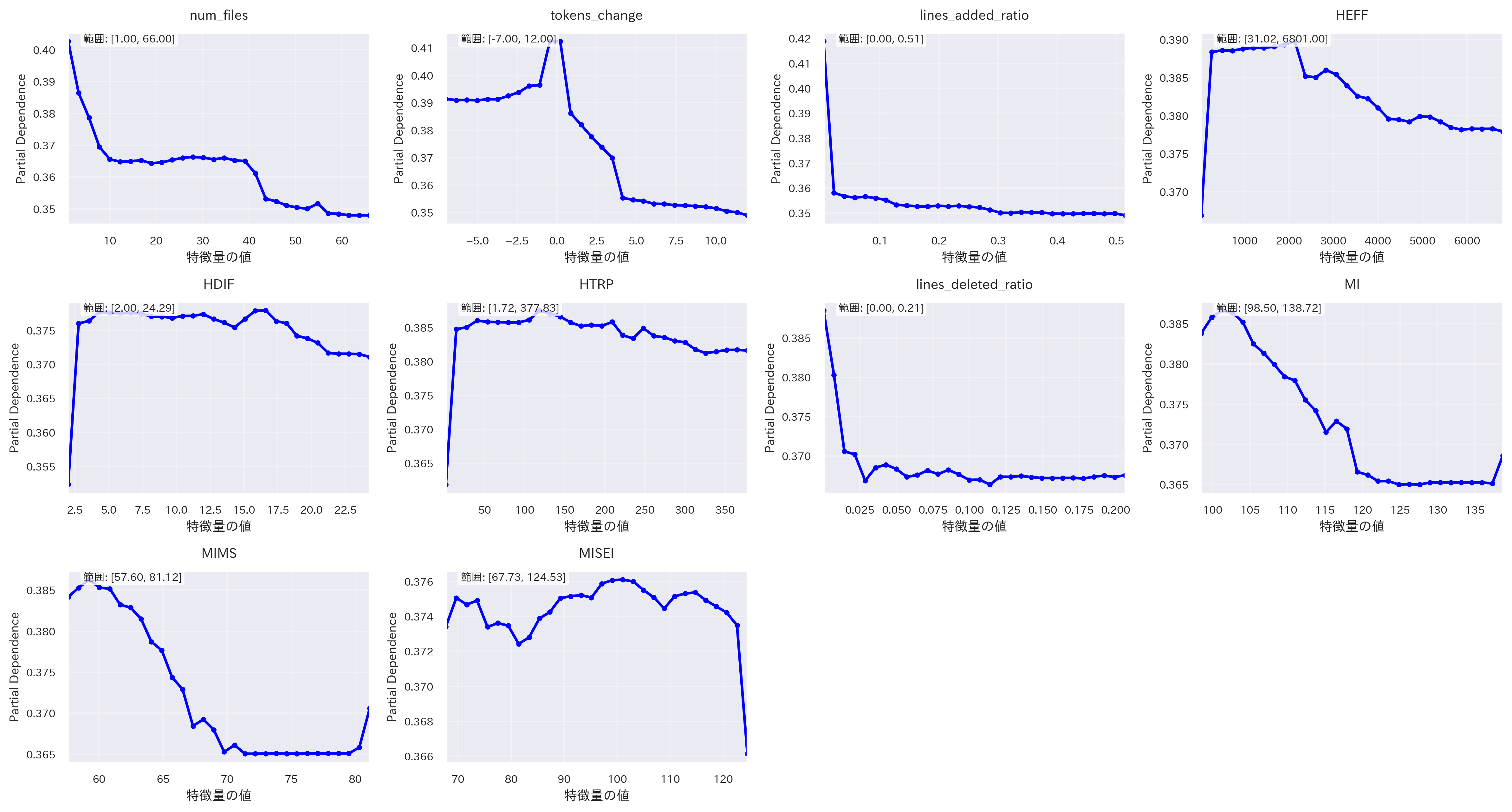 - 変更されたファイル数(num_files)、トークン数の変化量(tokens_change)、変更対象となったファイルの平均行数(lines_per_file)は多くのプロジェクトにおいて重要度が高い